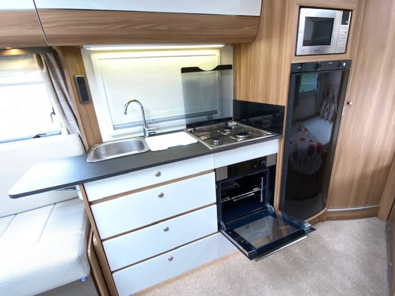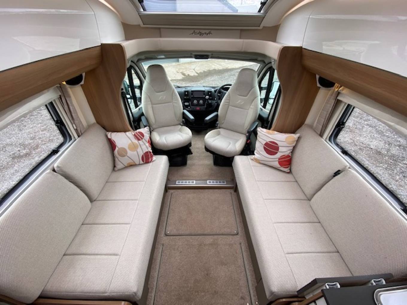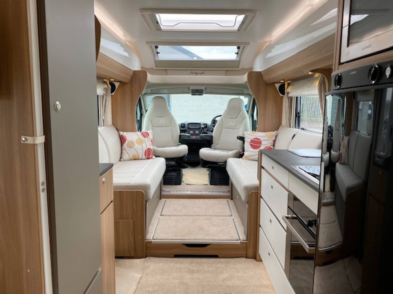 This 2017 4 berth, Bailey Autograph 75-2 motorhome features a rear French bed and two side facing bench seats, which convert into an additional double bed. The motorhome is light and airy with panoramic Heki roof lights and the habitation area feels very spacious. There are aero style lockers in brilliant white throughout the motorhome, which give a contemporary look whilst providing a practical storage solution. The large continental style kitchen area has a combi oven/grill and gas hob with 3 gas rings and an electric hot plate, a microwave, sink and 3-Way fridge/freezer. The wash room, located adjacent to the French bed consists of a wash basin, separate shower and electric flush cassette toilet. The cab area has swivel cab seats, a multimedia system including Bluetooth phone connectivity, multi-function steering wheel, electric windows and mirrors, cruise control, cab air conditioning and a reversing camera. This is a lovely example of one of the most desirable UK motorhomes on sale today! This one has been very well looked after and has covered just 11,500 miles from new. It was serviced in July 2020 and had a habitation check in August 2020. The MOT expires in August 2021. Two belted seats.