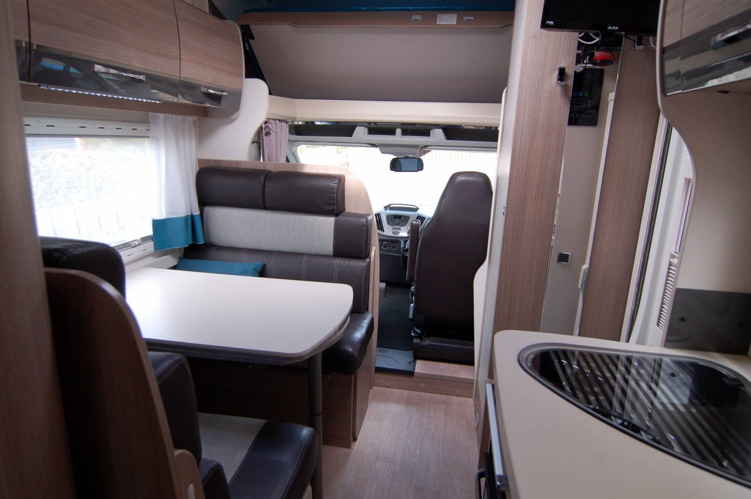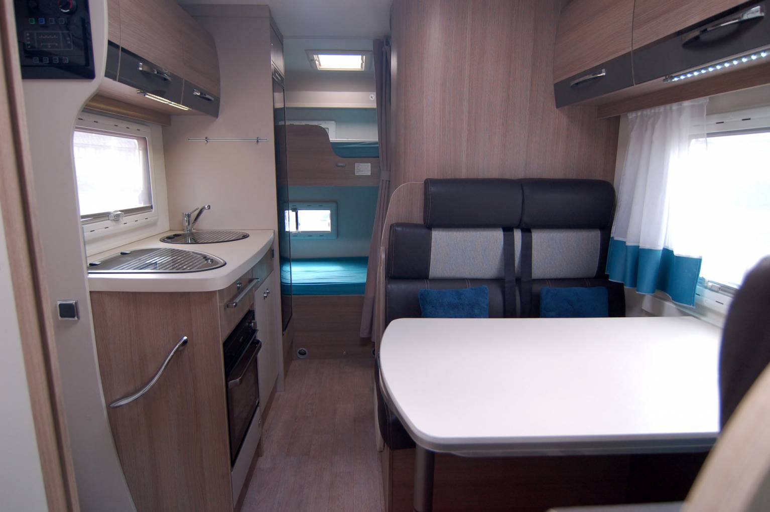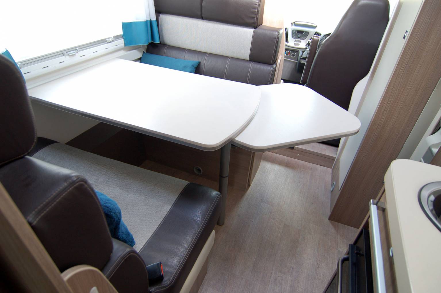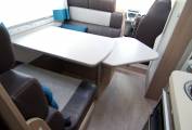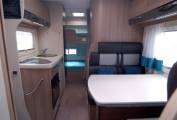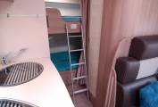 In the central area is a large wardrobe opposite the dinette, which has 4 seatbelts and a swivel table extension. The dinette can be converted into a three quarter or larger bed using slide out extensions.