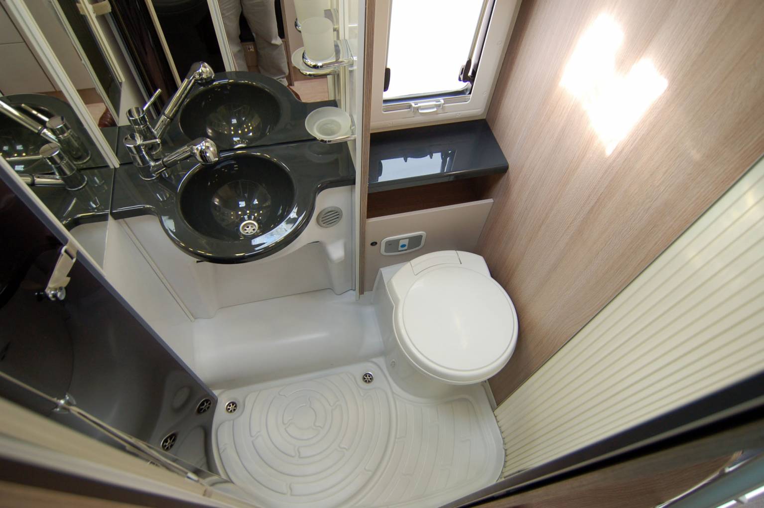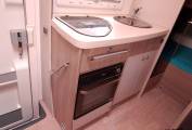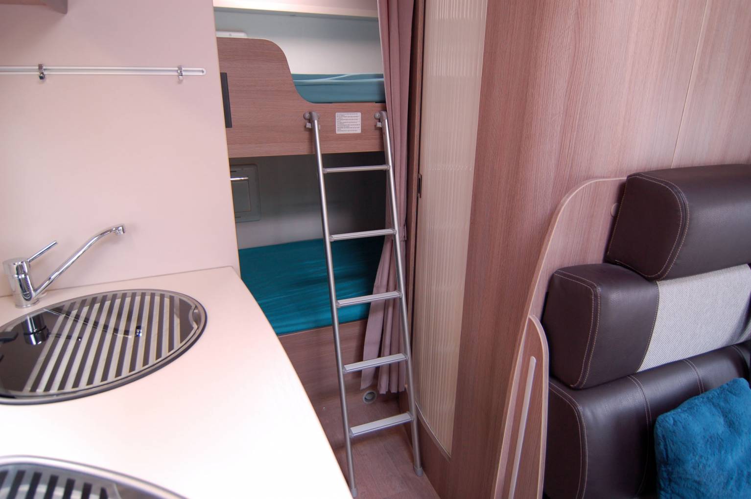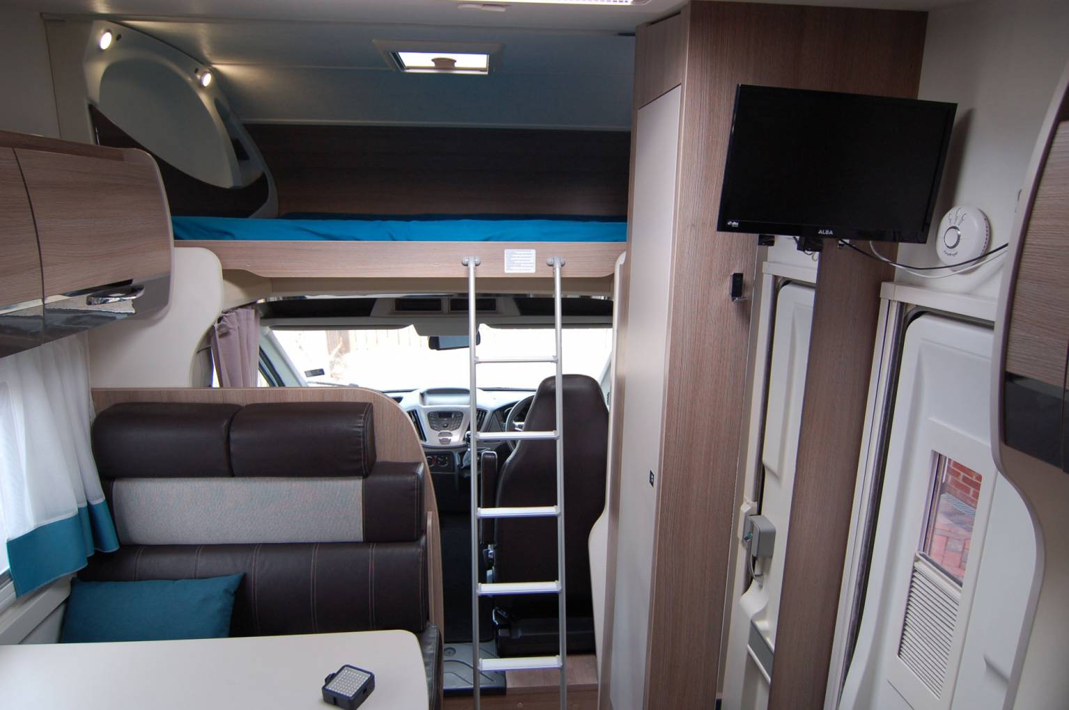 At the rear are two full sized bunks, the lower of which raises to create the garage space which has external access from both sides of the motorhome. Big enough to accommodate a variety of bulky holiday gear, the garage is a family boon.