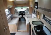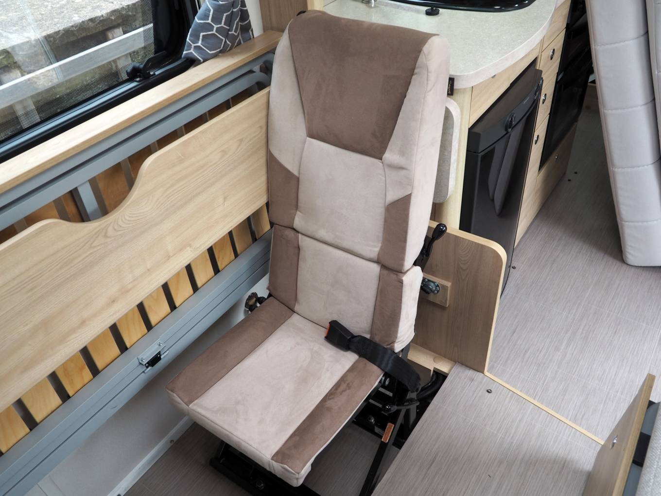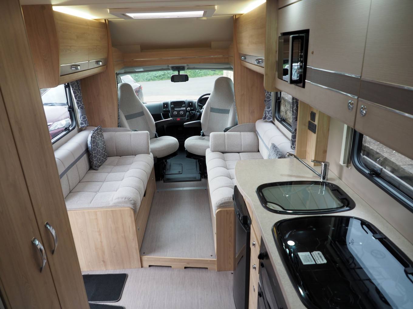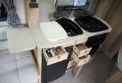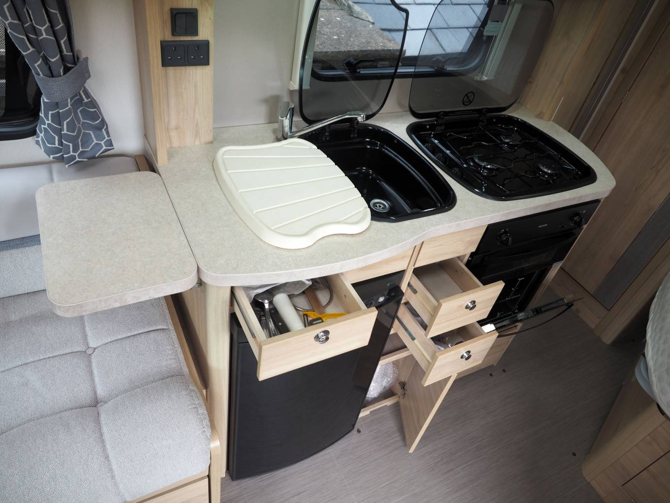 The forward lounge is a light and airy space, 6 can sit here for a social with the cab seats swivelled. Under each of the bench settees is a factory fitted pop up travelling seat, each with a 3 point seatbelt. For 2 berth users, the seats can be removed easily to maximise storage. The dinetted can also make good sized double bed. Midships you will find a full kitchen including gas hob, oven and grill, unused fitted microwave, good sized fridge with freezer box, and a pop up worktop extension.