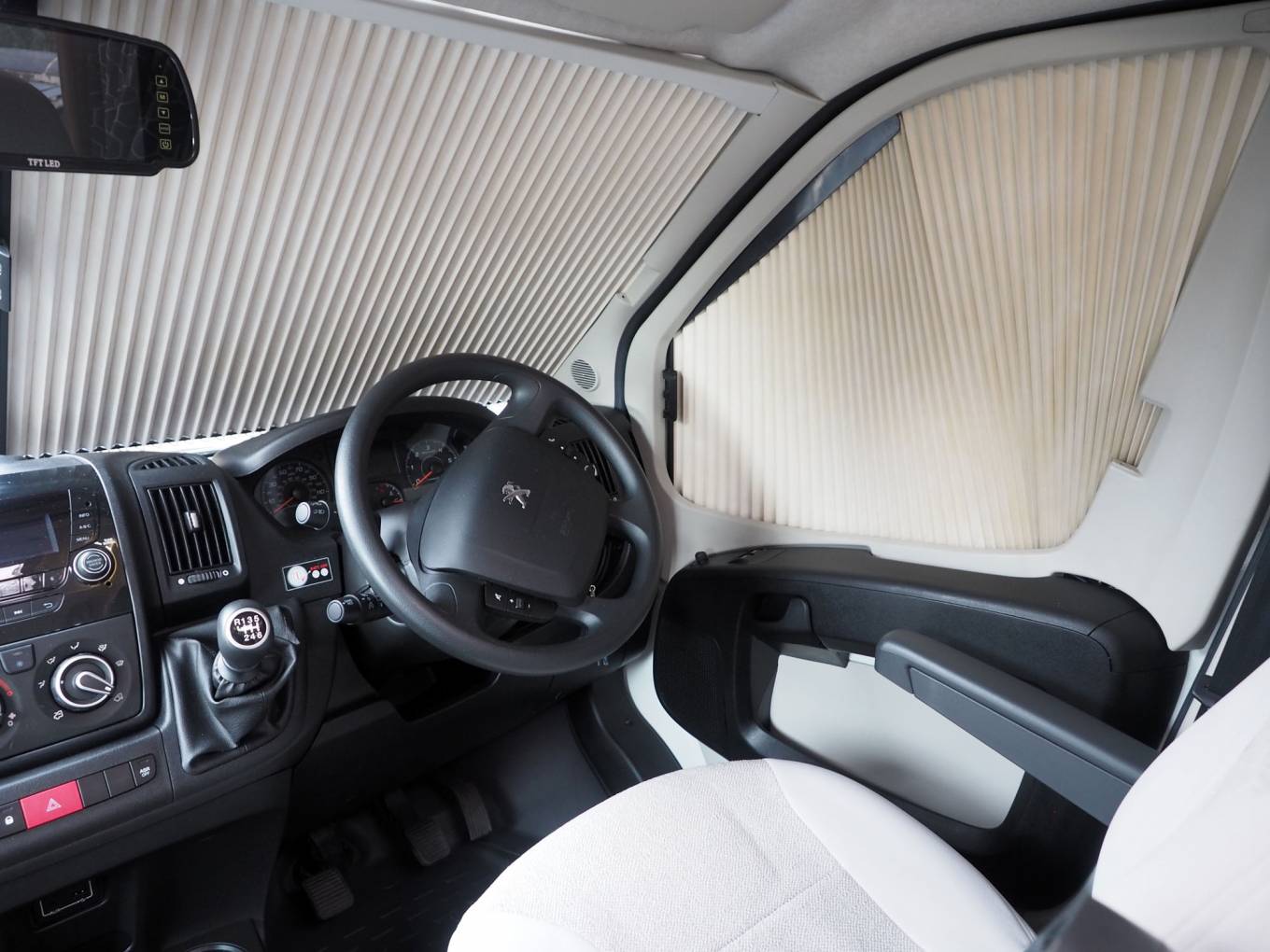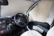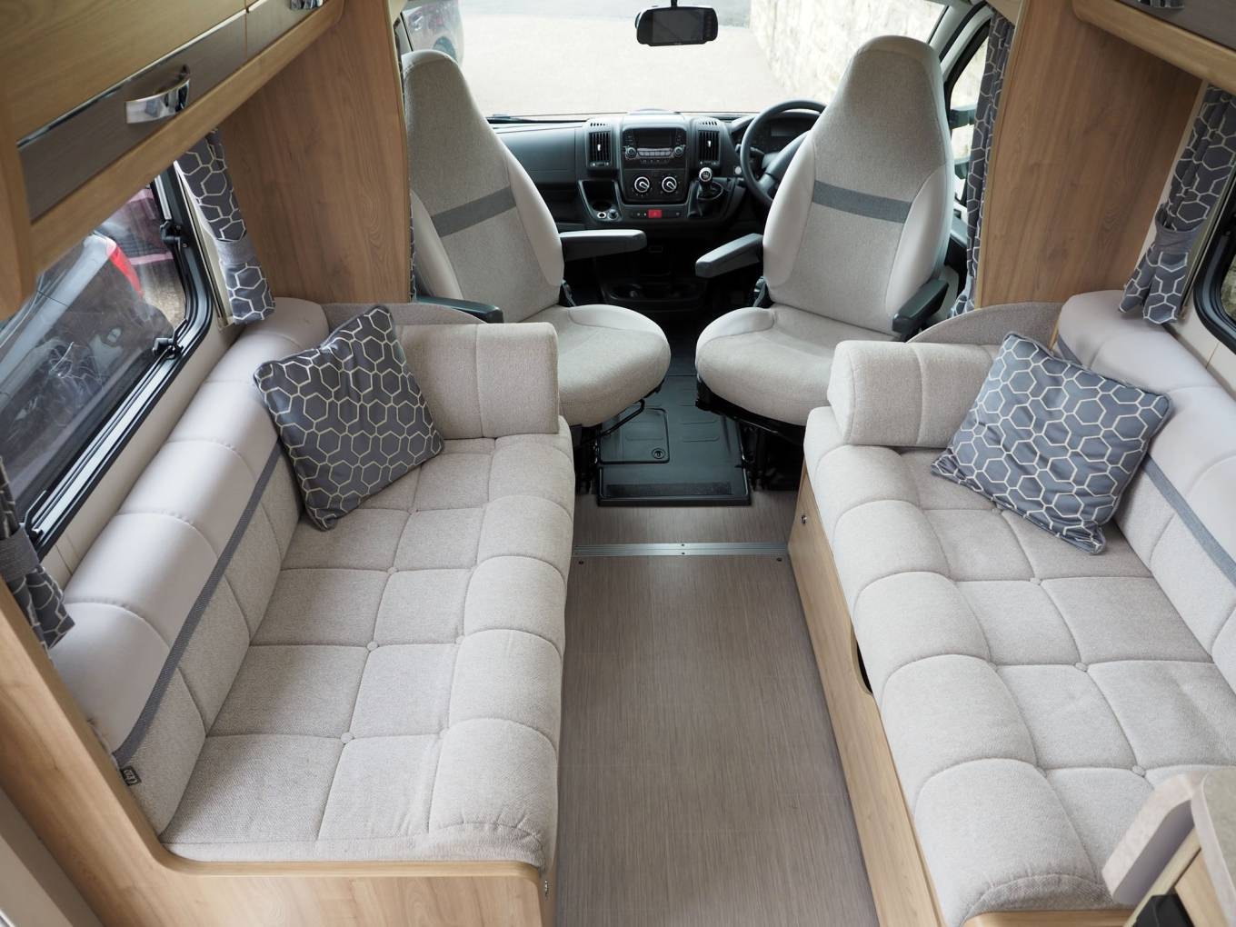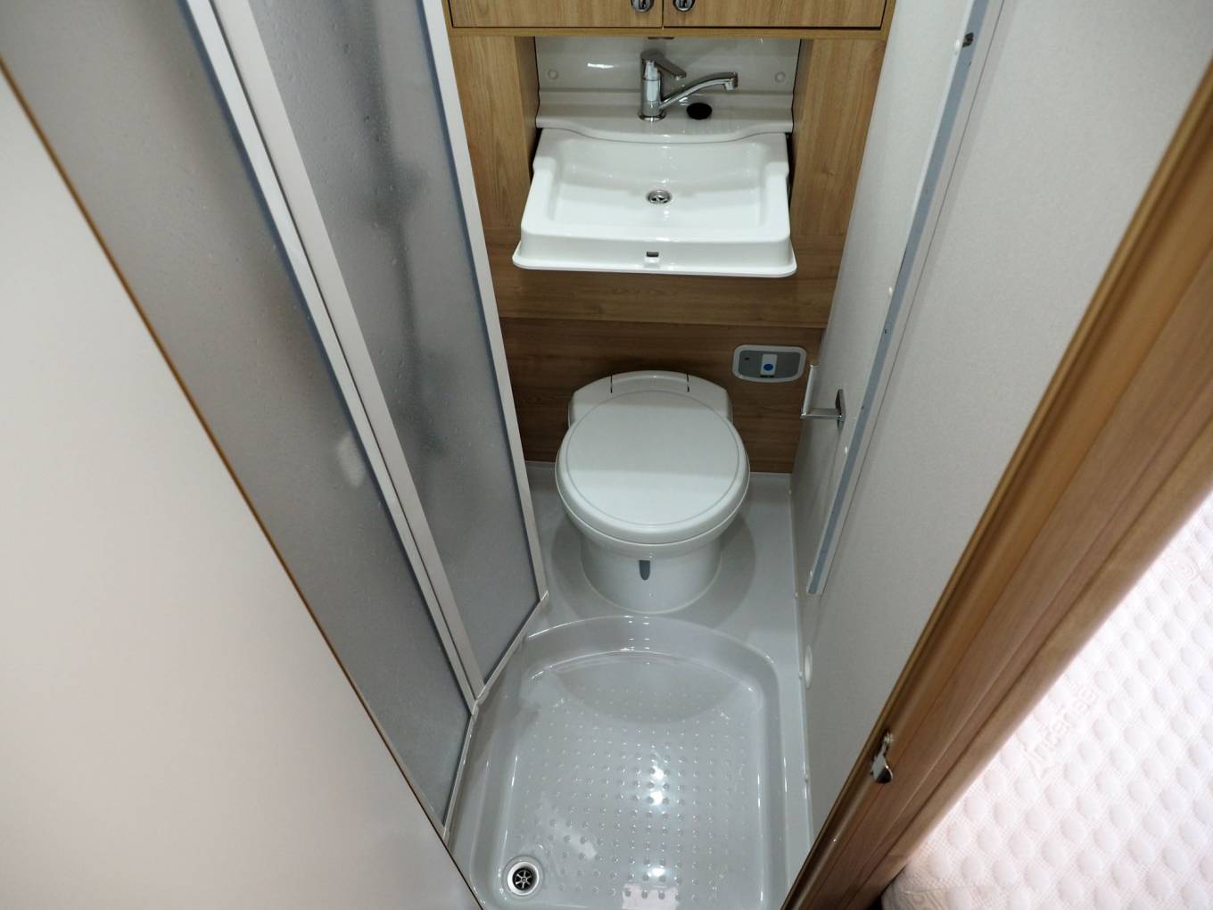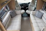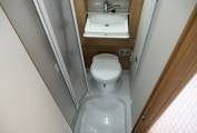 There is good storage throughout this motorhome including a deep wardrobe, underbed storage with external access and a range of lockers. The bed is of good size with a privacy partition, with the washroom adjacent, featuring an internal partition to create a shower cubicle, tip up sink, toilet and vanity storage. The cab features integrated night blinds, reversing camera, cab air conditioning and an external insulation screen cover.