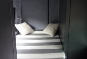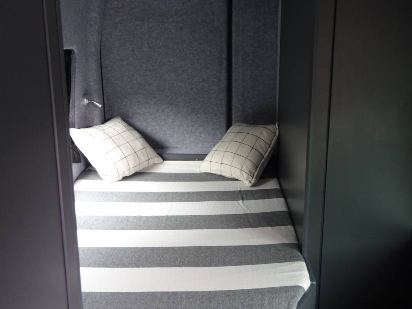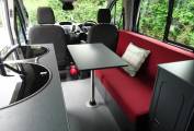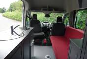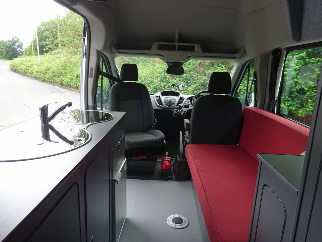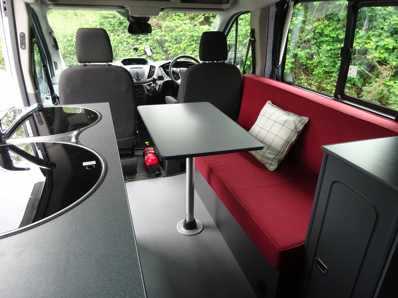 This camper has been newly converted by its current owners to a very high standard with an individual or a couple in mind who want to hit the road with ease. In the main section of the camper is a dinette area with spacious bench seating area and a centre table. There is a kitchen with a 3 ring gas hob, under the counter fridge freezer, sink with running hot and cold water and plenty of storage space.