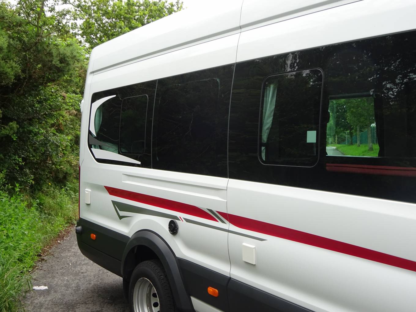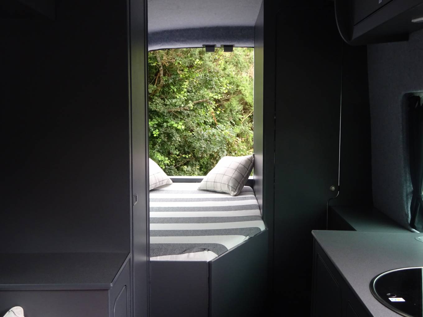 Towards the back of the Camper Van you have a spacious fixed double bed. At the very end of the bed are double doors which open outwards giving you the ability to lie in bed with the doors open and view the wonderful scenery where you have parked up. Also at the back are the compact washroom/shower facilities. This van comes with all the amenities to allow for comfortable off-grid camping, if that is what you are wanting from a camper. It is also highly suitable for those shorter, more basic trips out.