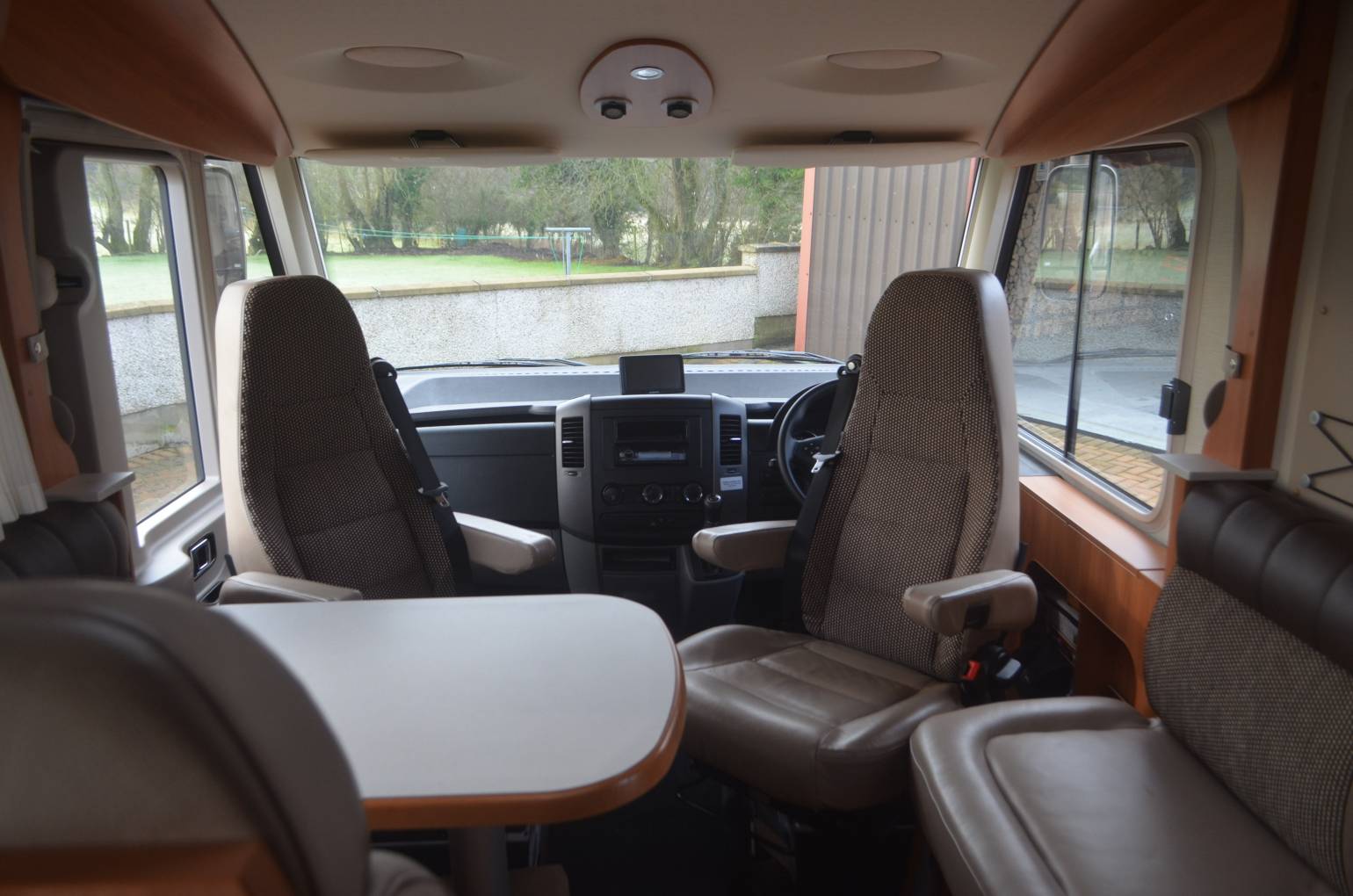 2017 HYMER ML-I 630 FOR SALE. Based on a Mercedes Benz 319 CDI chassis with a 2.1 engine and an Automatic transmission. 1 owner from new. This German built luxury motorhome is presented in excellent condition and comes with a high specification list. 10500 miles travelled. Weight is 4200kg, length approximately 7.88 metres and width 2.22 meters. The spacious layout has sleeping places for 4 people and 4 travelling seat belts. Cab area has a panoramic windscreen, swivelling captains chairs, multi function steering wheel, reverse camera, electric step at the passengers door, cab blinds, cd player/radio and heated mirrors. Featuring a fixed island bed at the rear with a memory foam mattress and storage units. The large drop down bed above the cab will accommodate another 2 people. Kitchen is centrally located and has a full sized cooker with a 3 burner gas hob, grill, oven, sink and a large fridge with separate freezer compartment. The en suite bathroom has a wash hand basin, cassette toilet, and a vanity mirror along with a separate shower cubicle on the opposite side. Blown heating and hot water are provided by the Truma system. Forward facing front lounge is spacious and will accommodate up to 6 people for dinning. The cab and dinning area seats are Tobago trim and leather. Extra fitted include a Tv/dvd player, outside gas point, front and rear parking sensors, a Tracker, a tow bar and an electric cab blind.