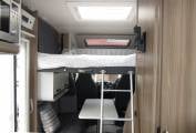 bunk beds with the bottom bunk being able to be utilized as a garage when travelling.