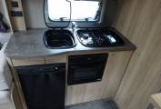 This 2 berth motorhome has a front lounge which converts into a generous bed, has mid kitchen and rear a spacious end washroom with a separate good sized shower cubicle. The washroom layout is fairly unique in this compact sized motorhome.