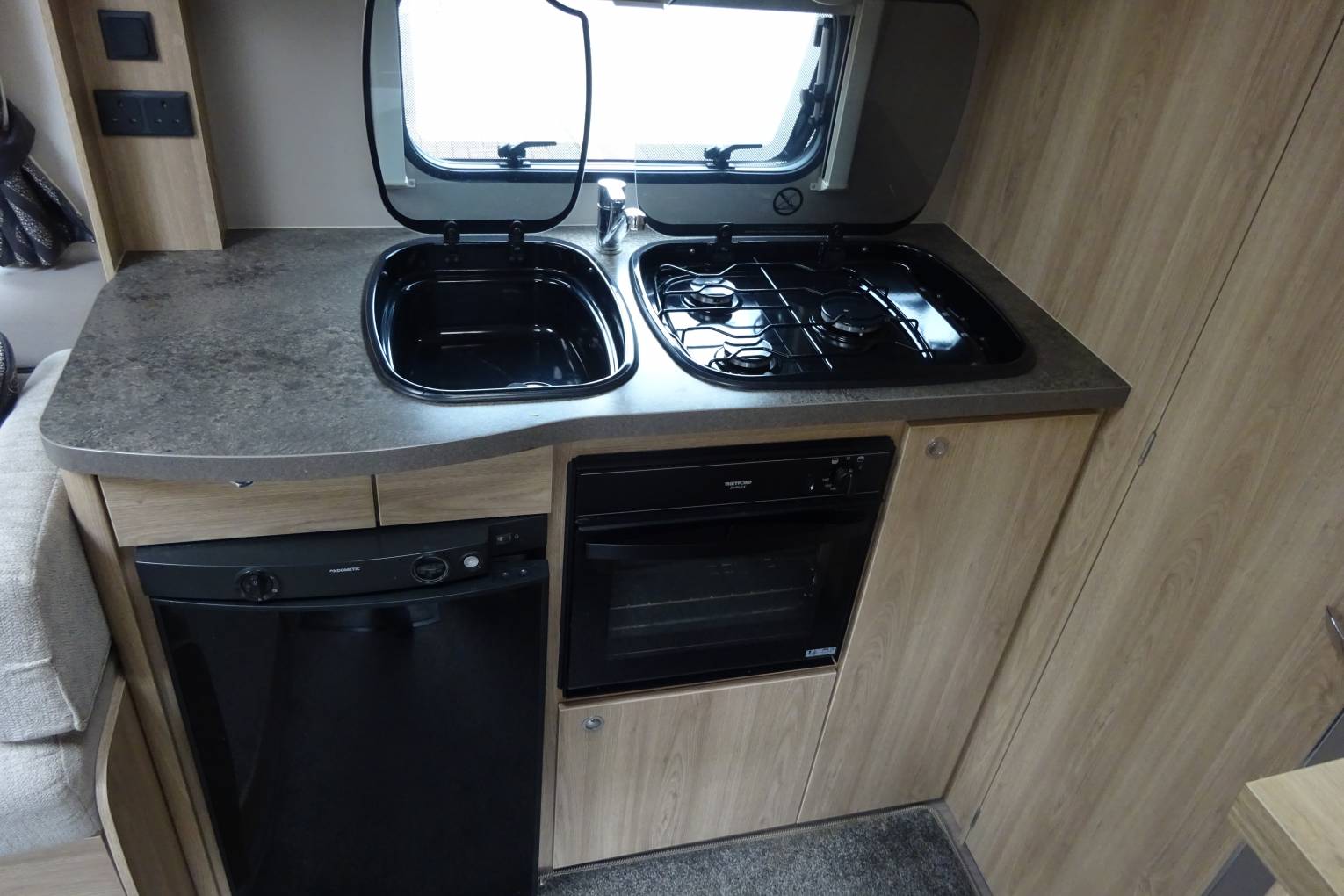 The Kitchen has a Sink with mixer tap - Hob with 3x gas rings – Oven and Grill - Three-way fridge with freezer compartment, Microwave.