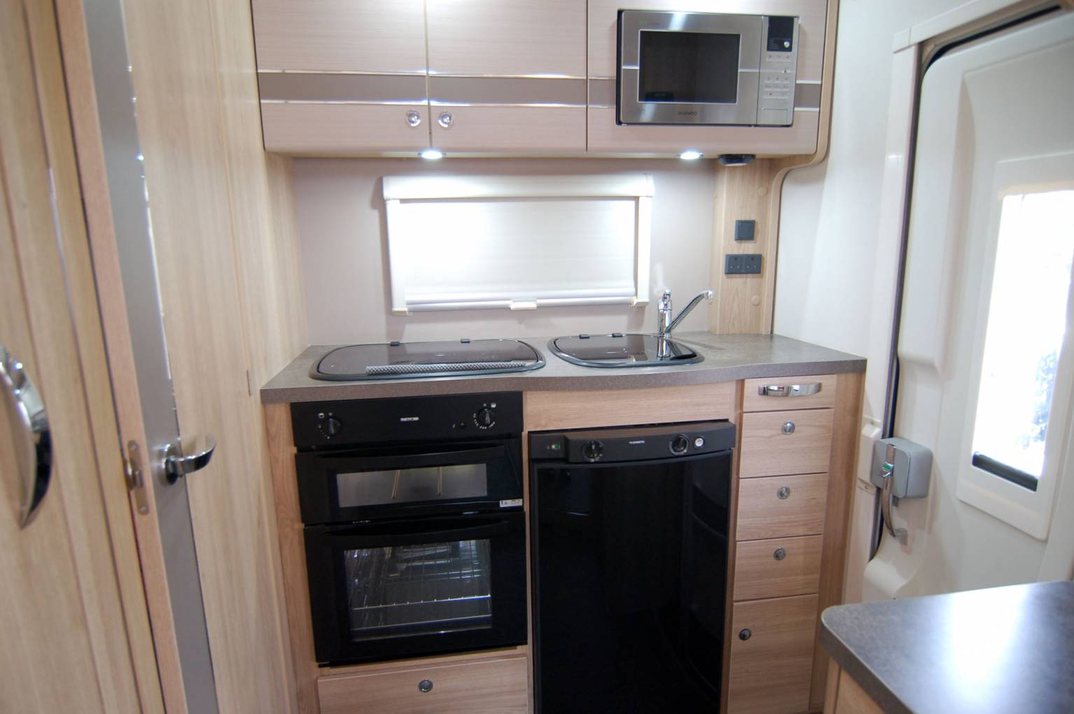 Other onboard features include fresh and waste water tanks, dual fuel hot water and heating systems, stain resistant upholstery fabric.