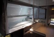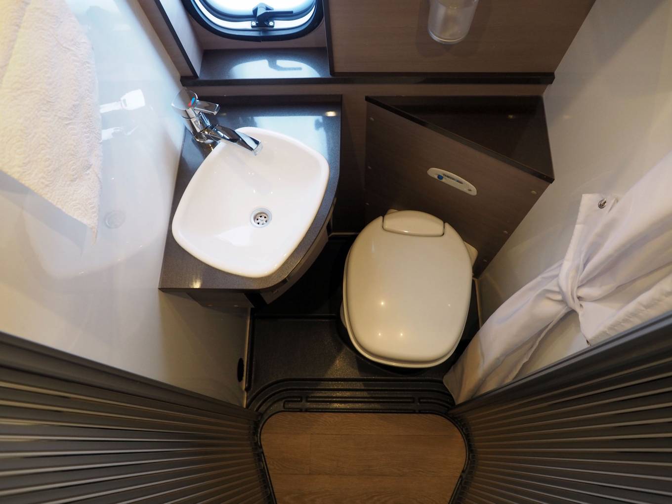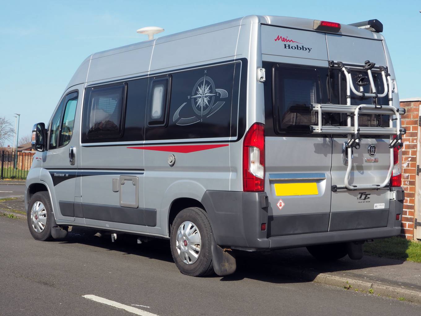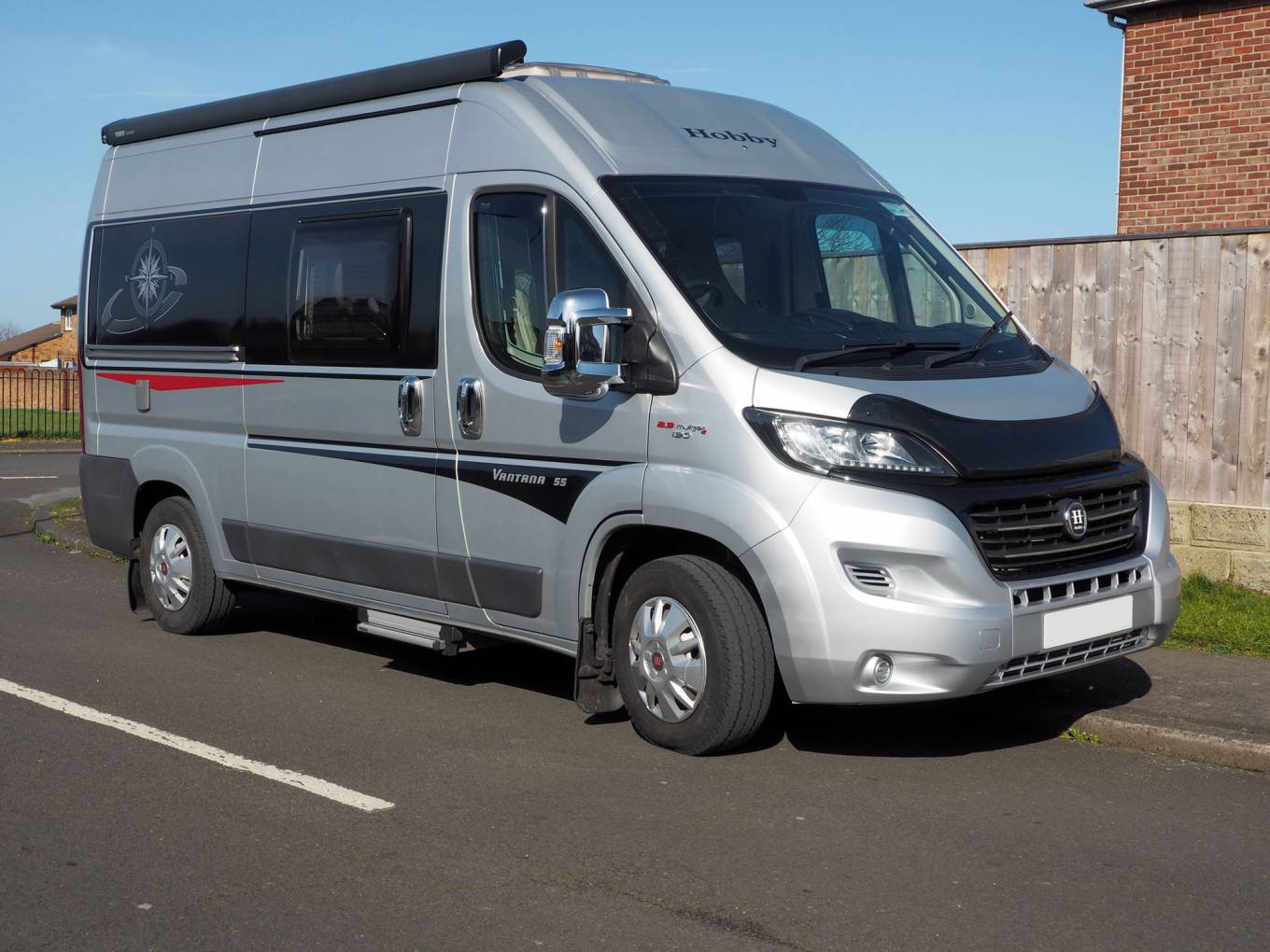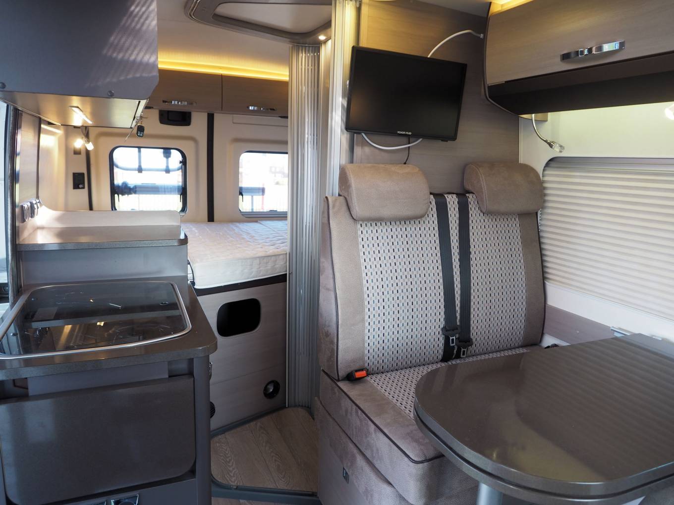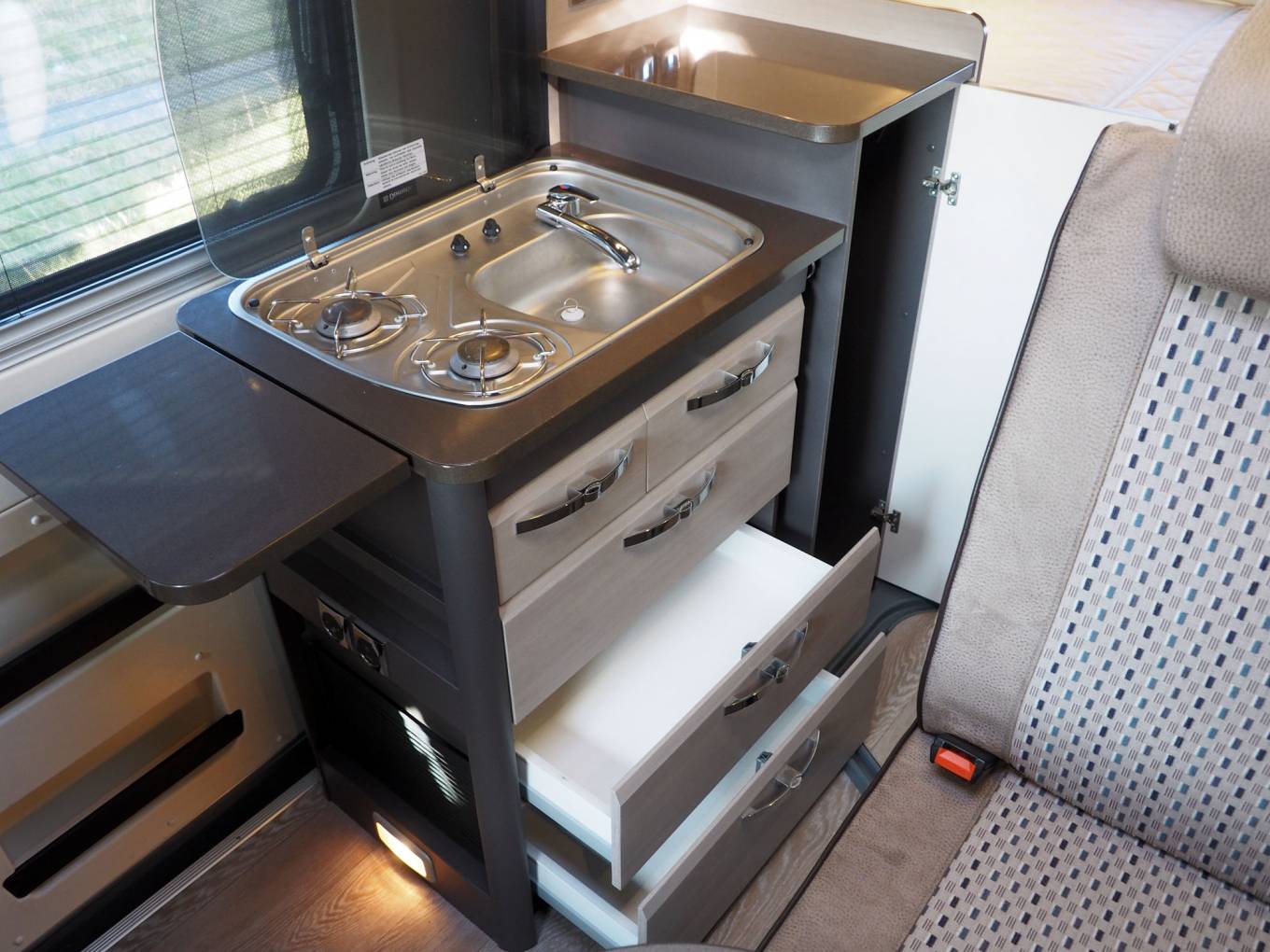 Essentially the layout of the 5.41 metre Hobby Vantana 55 comprises of a forward dinette with swivel cab seats and an extending table, midships kitchen and washroom and rear fixed double bed. There is plenty of lighting throughout including subtle mood lighting over top lockers plus individual spotlamps. The washroom features in ingenious shower enclosed by tambour doors, plus toilet and vanity sink. Onboard services include fresh and waste water tanks, Truma dual fuel heating and hot water, plus separate aftermarket diesel heating. The kitchen features a good array of soft close storage drawers, two burner hob, sink, side worksurface extension and large eye level fridge. No space is wasted with lots of storage pockets and lockers, including an underfloor compartment in the dinette.