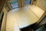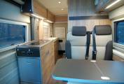 The compact kitchen offers a good range of storage, 65 litre compressor fridge, two burner hob and sink, plus a hook on worktop extension. Opposite this is the washroom with tip up sink, vanity storage, shower and toilet. To the front is a dinette with side mounted lift up table opposite the swivel cab seats, so four can sit in comfort. With the table stowed, the ladder can be attached to access the upper roof bed, probably the best poptop bed you will ever find, with the mattress in an inset fixed base, high lift, quality canvas with plenty of light and air, safety net.