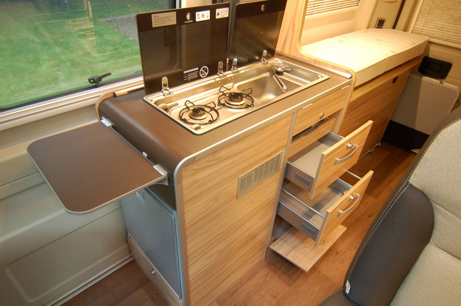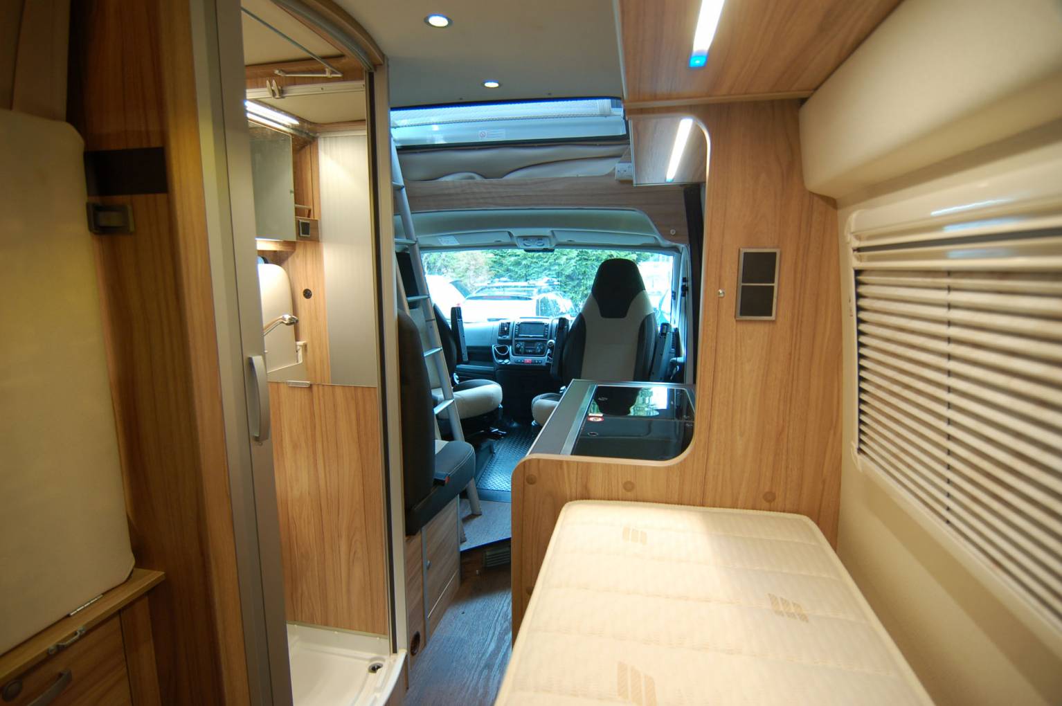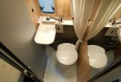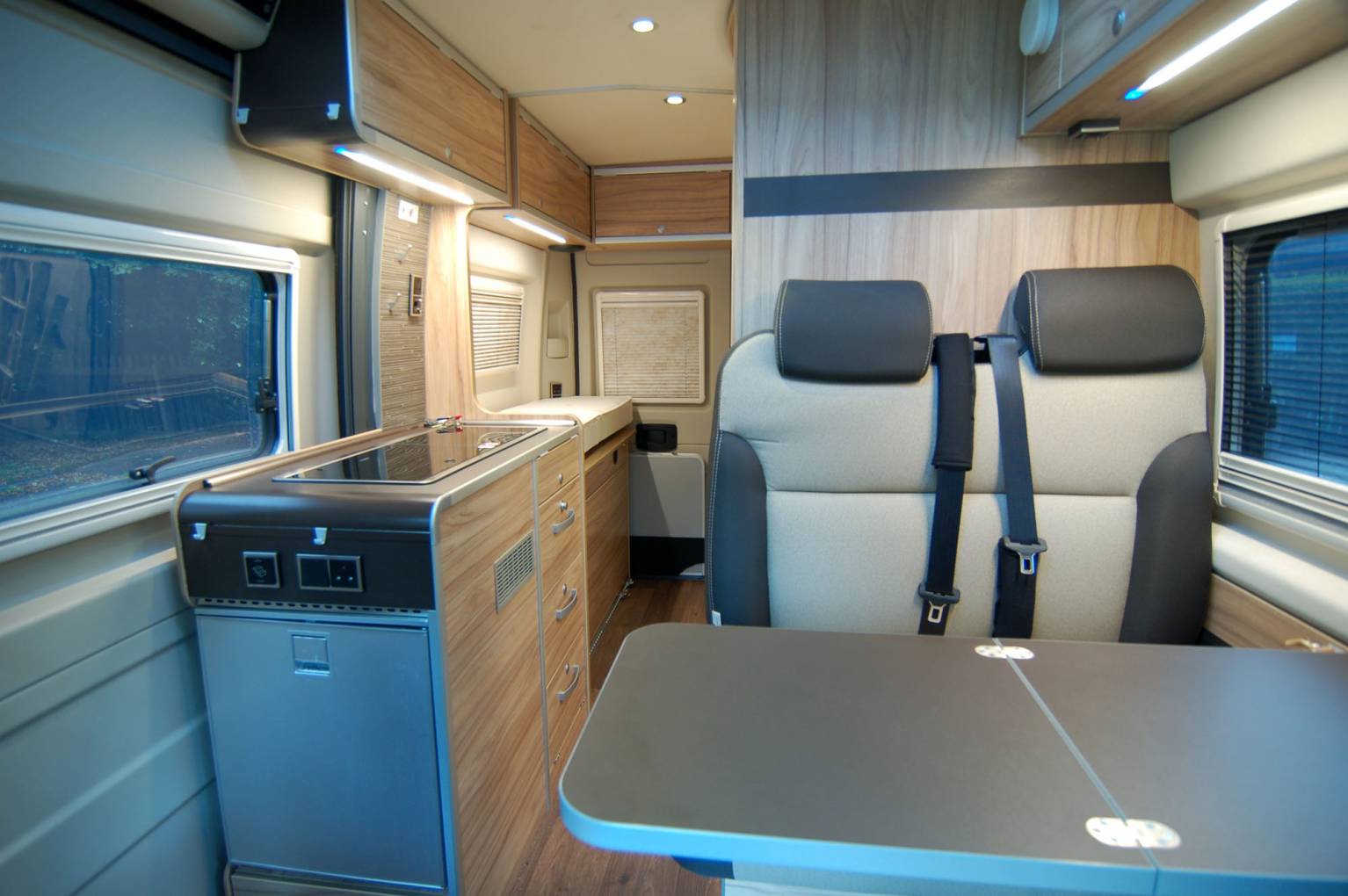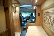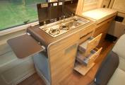 Every fitting and fixture is high quality and the layout comprises of a rear transverse bed of 196 x 138cm max and garage combination, centre kitchen and washroom, forward dinette and large upper roof bed of 200 x 135cm. Both beds are substantial and comfortable, the lower bed having the Hymer Comfort system supporting the mattress cushions. The centre section of the rear bed is easily hinged to create a garage store. Also here is the Gaslow refillable domestic gas supply, fill up for a fraction of the price of bottled gas. The rear doors have fitted opening windows with blinds and flyscreens, storage for an external table with two chairs to match.