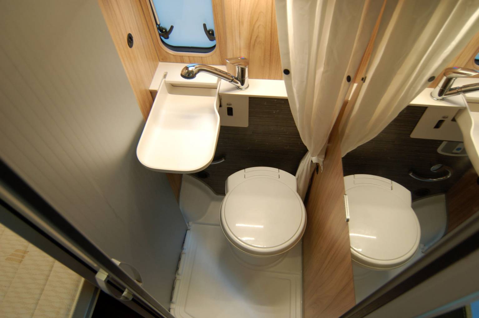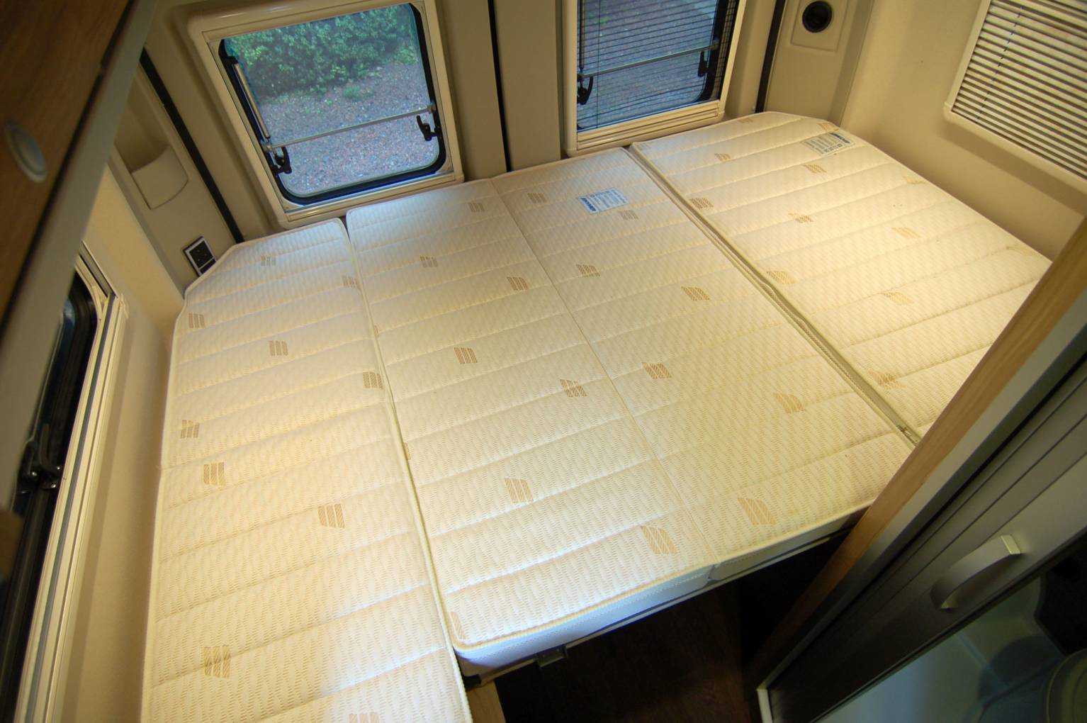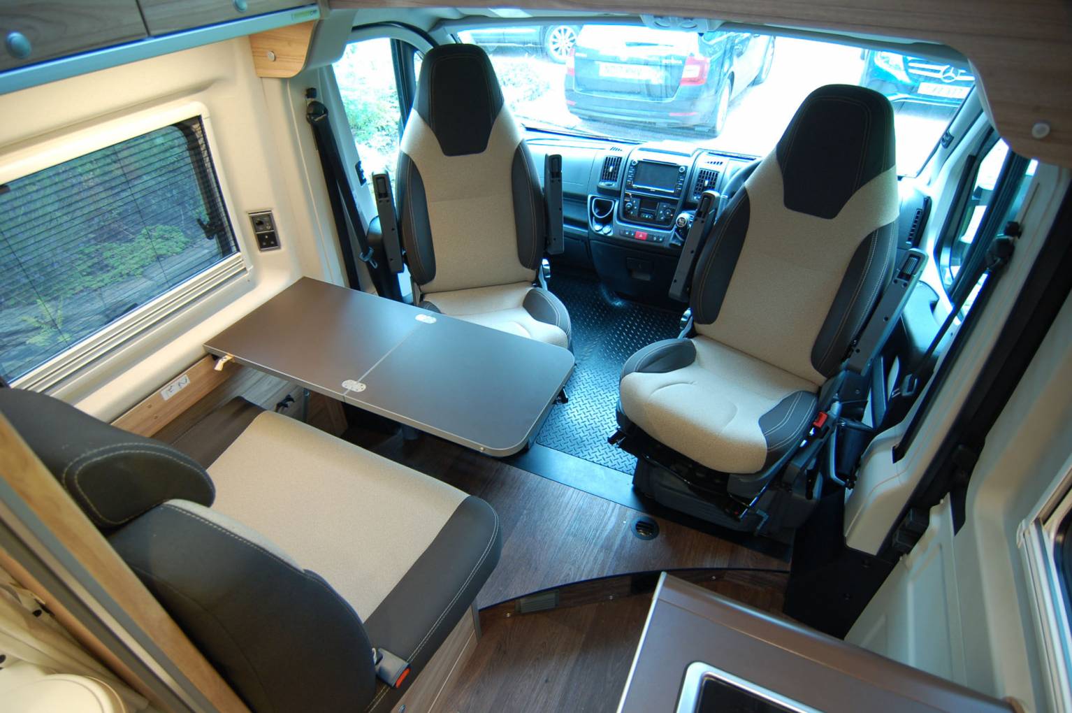 Every fitting and fixture is high quality and the layout comprises of a rear transverse bed of 196 x 138cm max and garage combination, centre kitchen and washroom, forward dinette and large upper roof bed of 200 x 135cm. Both beds are substantial and comfortable, the lower bed having the Hymer Comfort system supporting the mattress cushions. The centre section of the rear bed is easily hinged to create a garage store. Also here is the Gaslow refillable domestic gas supply, fill up for a fraction of the price of bottled gas. The rear doors have fitted opening windows with blinds and flyscreens, storage for an external table with two chairs to match.