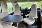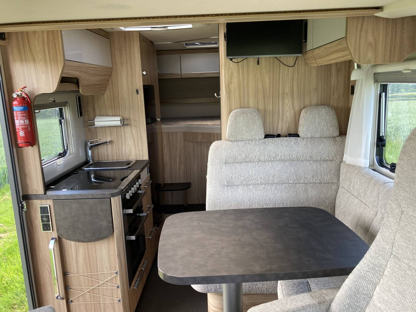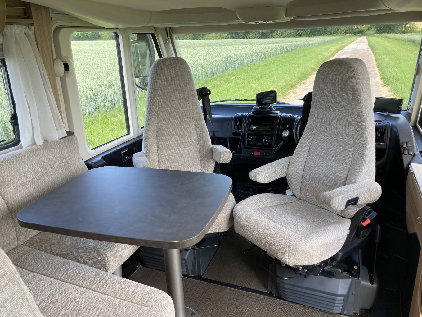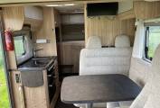As you entre the motorhome via its habitation door your have the dinette area in front of you. With the two captains chairs that swivel round there is ample room for four people to eat comfortably. This area also has 2 x 3 point harnesses making it a 4 seat belt vehicle.