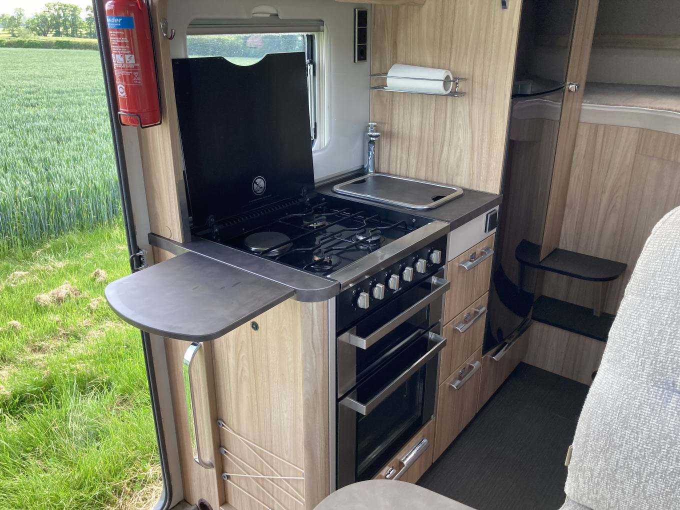 The kitchen to the left of the habitation door is well equipped with a 3 ring burner and electric plate hob, good sized sink with hold and cold running water, full fridge with separate freezer compartment, and oven.