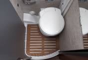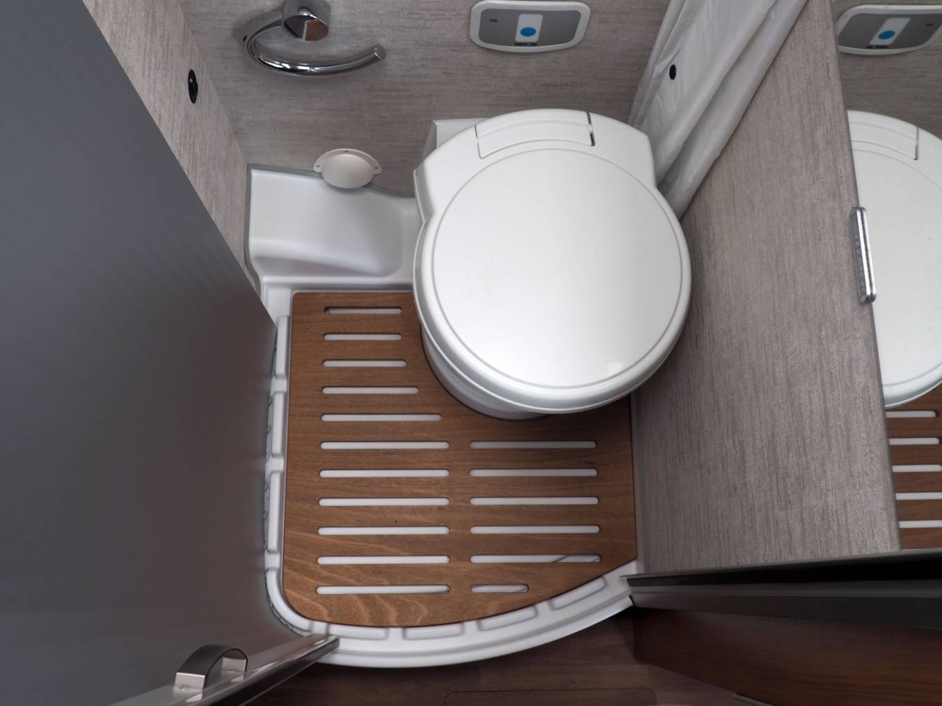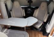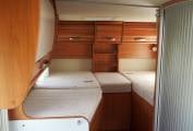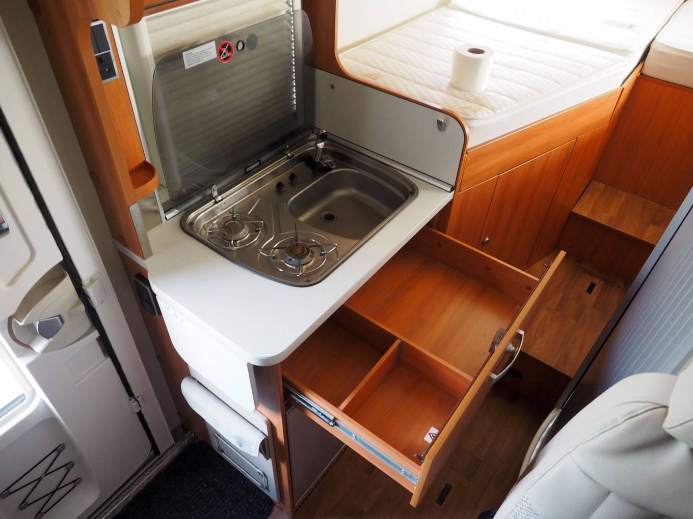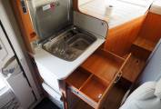 Internally the layout comprises of a forward dinette with swivel cab seats opposing a forward facing dinette seat with 2 seatbelts making 4 in total, a midships kitchen and washroom, then comfortable, generous twin single beds over the heated rear garage. Absolutely no space is wasted and the Hymer has an excellent range of of storage cupboards, drawers and cubbyholes. Whilst the kitchen is small with a combined sink and hob, there is a pop up worktop extension and the dinette table has an extension too, adding workspace. In the heated washroom you will find a toilet, tip up vanity sink with pull up shower head and curtain for the entrance.