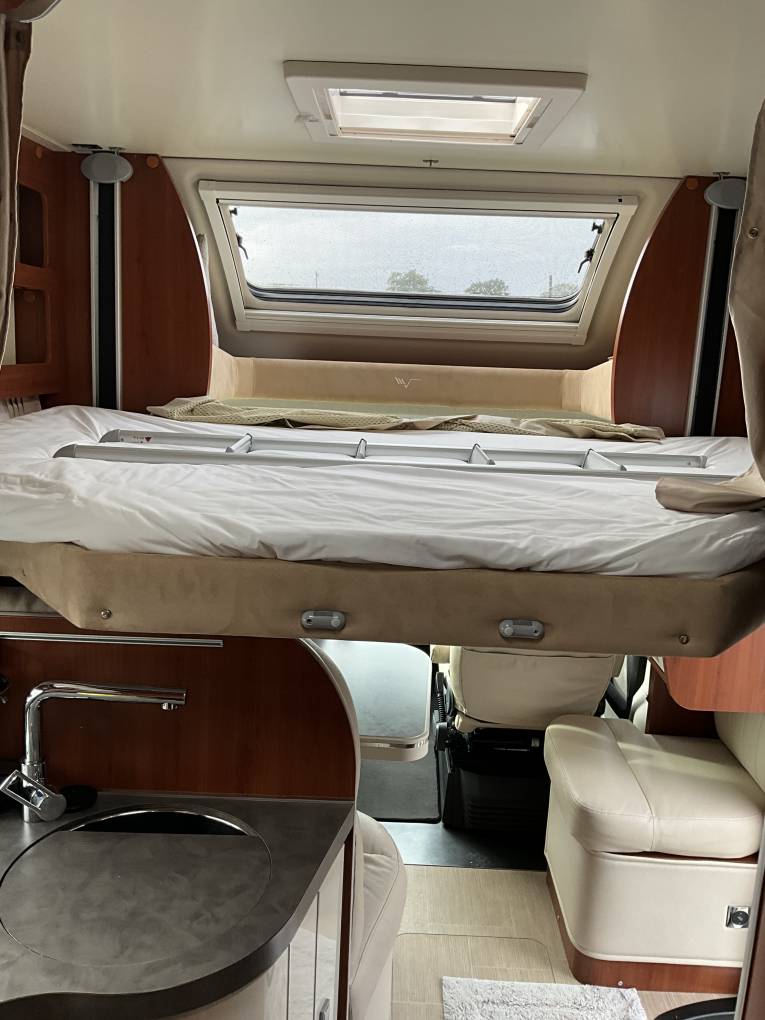The main section of the motorhome boast a dropdown electric double bed along with habituation air conditioning unit.