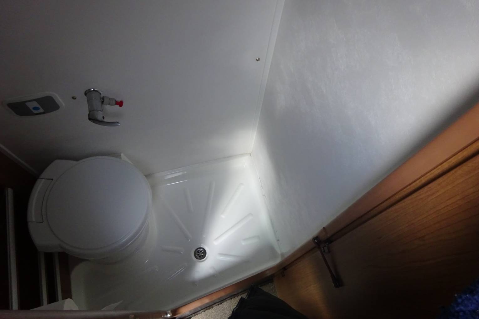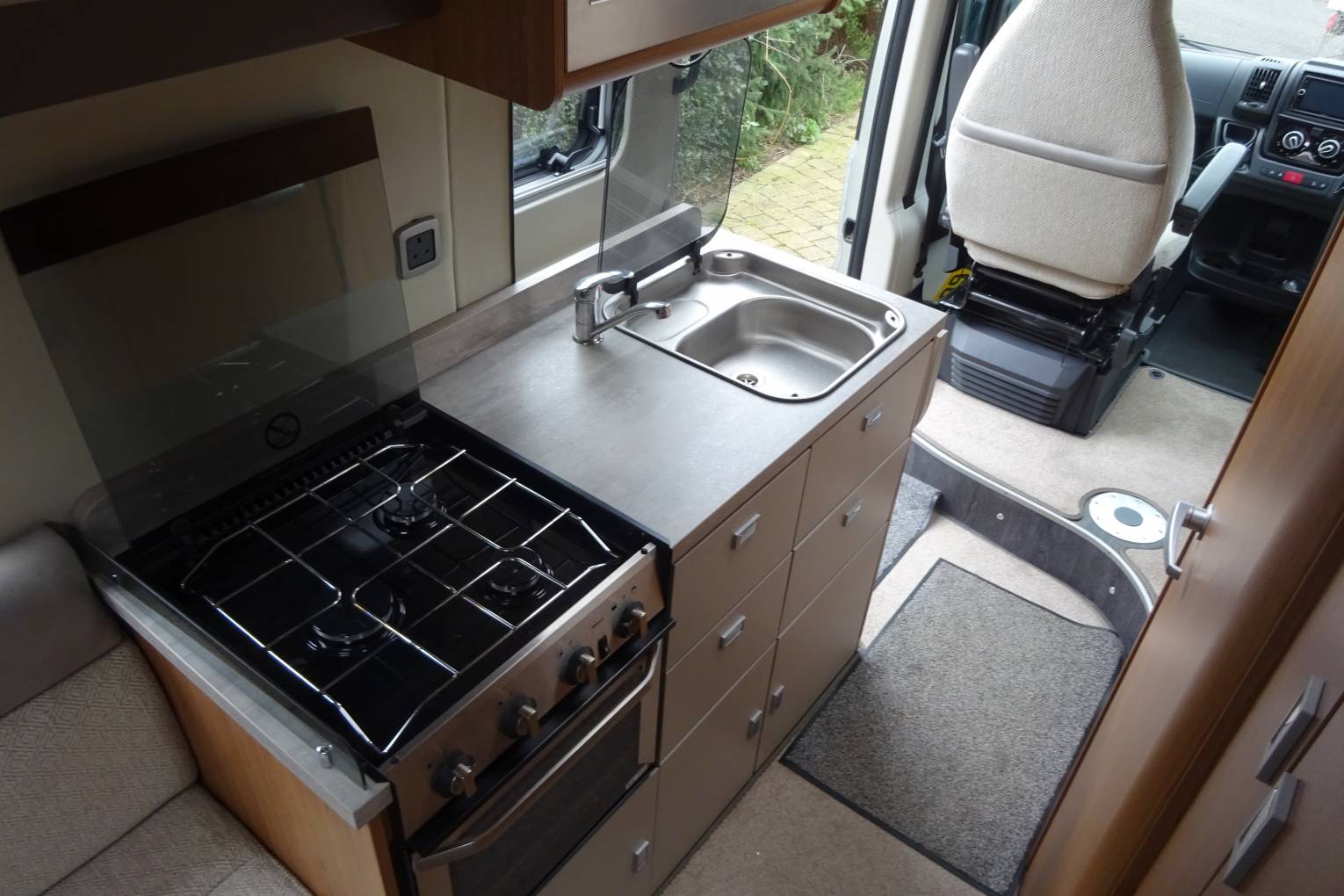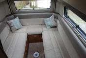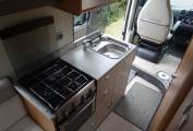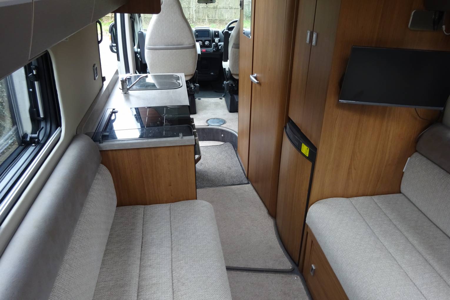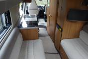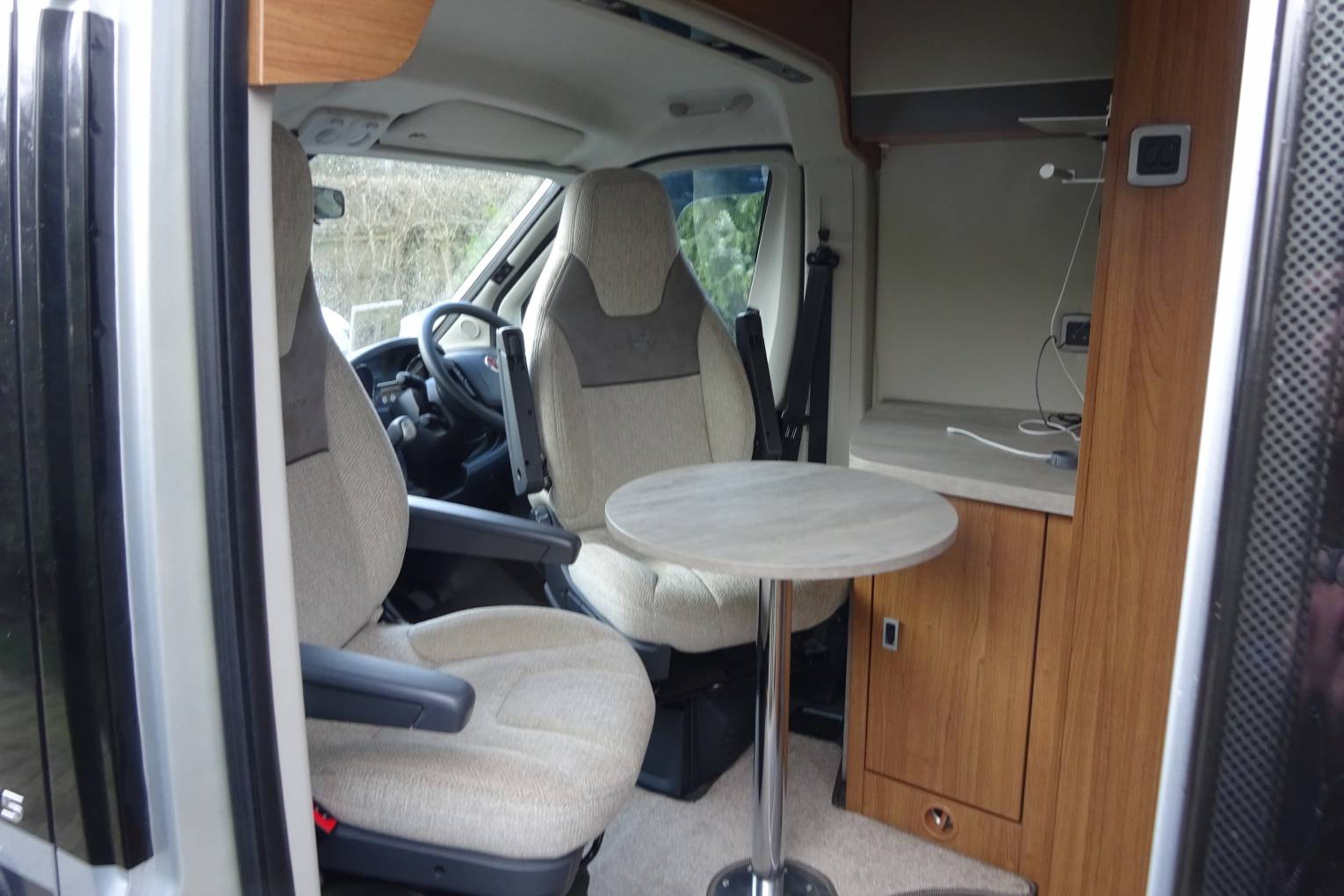 The front the driver and passenger seat swivel round to give extra seating and an occasional coffee table can be positioned in front of these seats. A rather larger free standing dining table is stowed for travel in the cupboard and can be positioned in the rear lounge with space enough for four people.