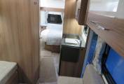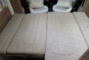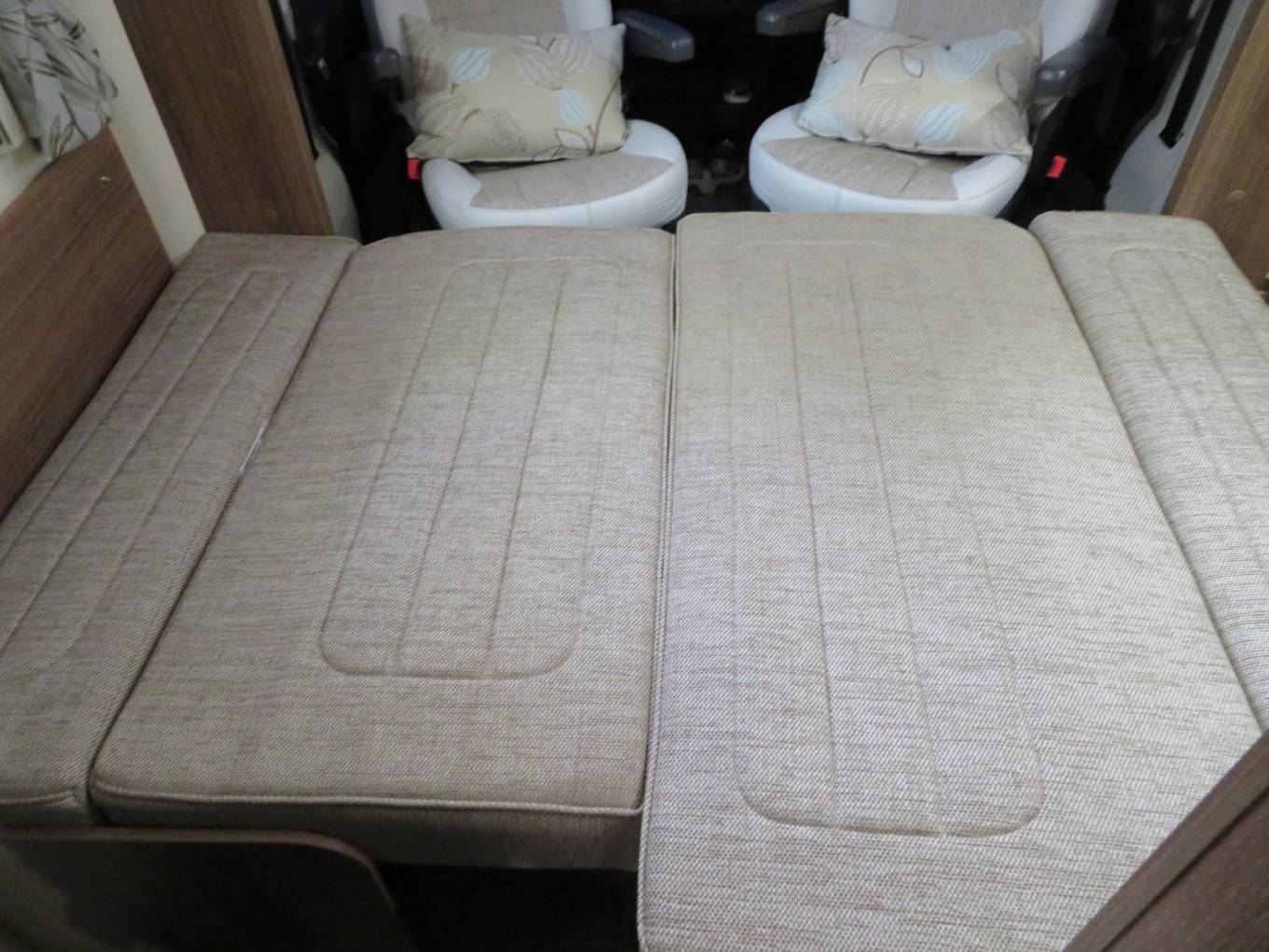 The front of the vehicle has a very spacious feel with double and triple seating arrangement, when combined with the both front seats swiveling caters for 7 people to sit comfortably, there is lots of storage bellow the seats and in the cupboards above and this also converts into the second double bed, there are two windows and a skylight above, along with the panoramic front skylight makes this area feel bright and spacious.