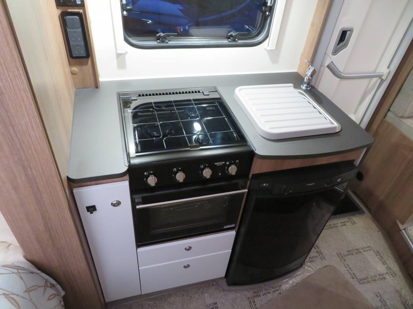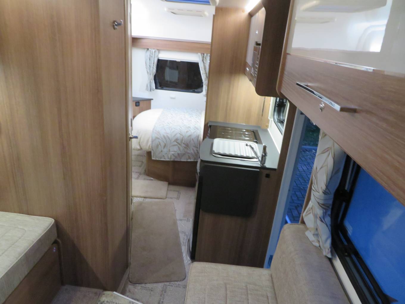 Starting at the rear of the vehicle there is a island bed running across the room with ample storage above and underneath, two large windows and a sky light giving a light and airy feel. The kitchen area is well equip with a three ring hob, microwave, combined oven and grill, fridge with ice box and a sink, there is plenty of storage above and below. Opposite the kitchen is the wash room with a cassette toilet, wash hand basin and a shower with separating curtain, the shower head has been upgraded to the orbital shower head, again there is storage to the top cupboards and a ventilation skylight to the ceiling.