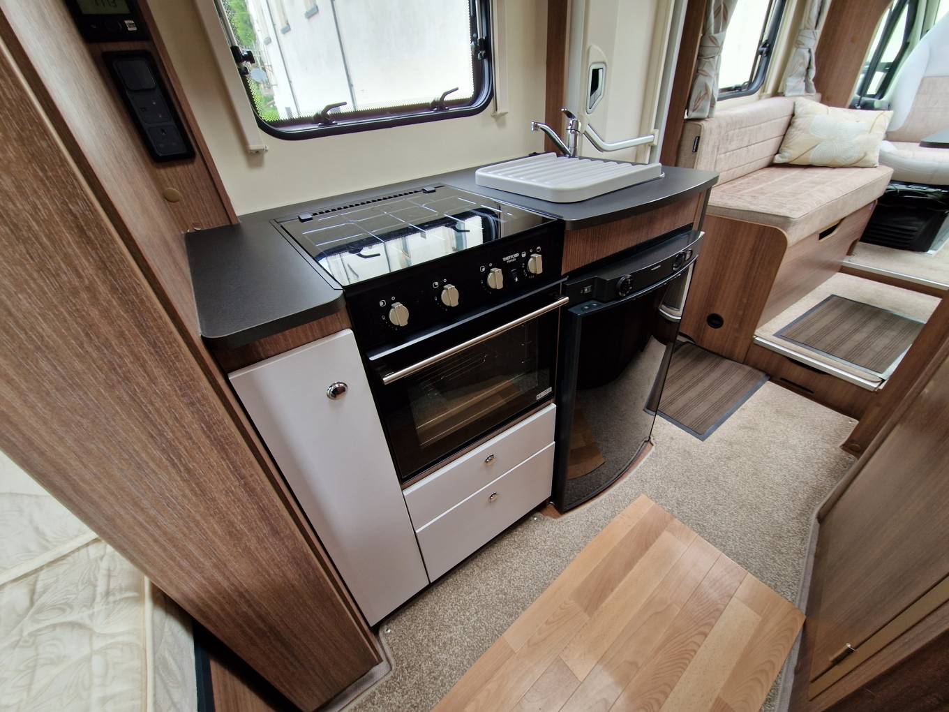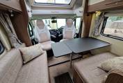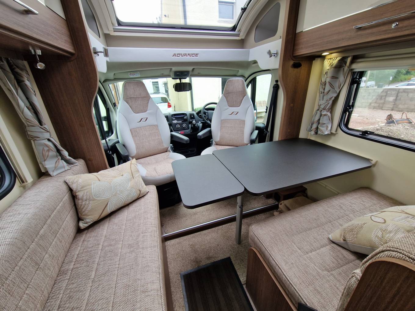 Living - Heating and hot water are provided by a Truma system on gas or electric,TV Aerial – External satellite input point - Electric hook up - 230v and 12v power points – gas bottle with crash safe regulator - LED spot lights - Dining table with extension - Awning canopy – Lots of internal and external storage - Window blinds and flyscreens throughout - panoramic roof.
