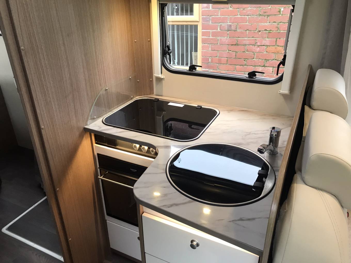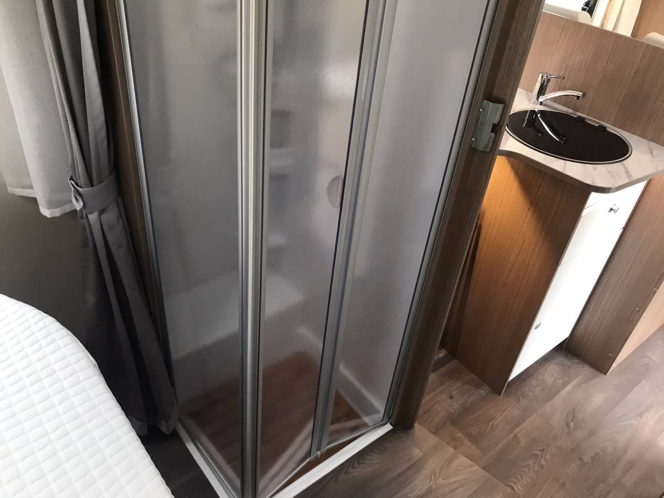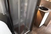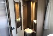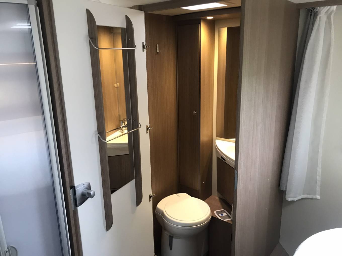 The washroom is located in the centre of the vehicle. This has a toilet, basin, shower and storage.