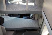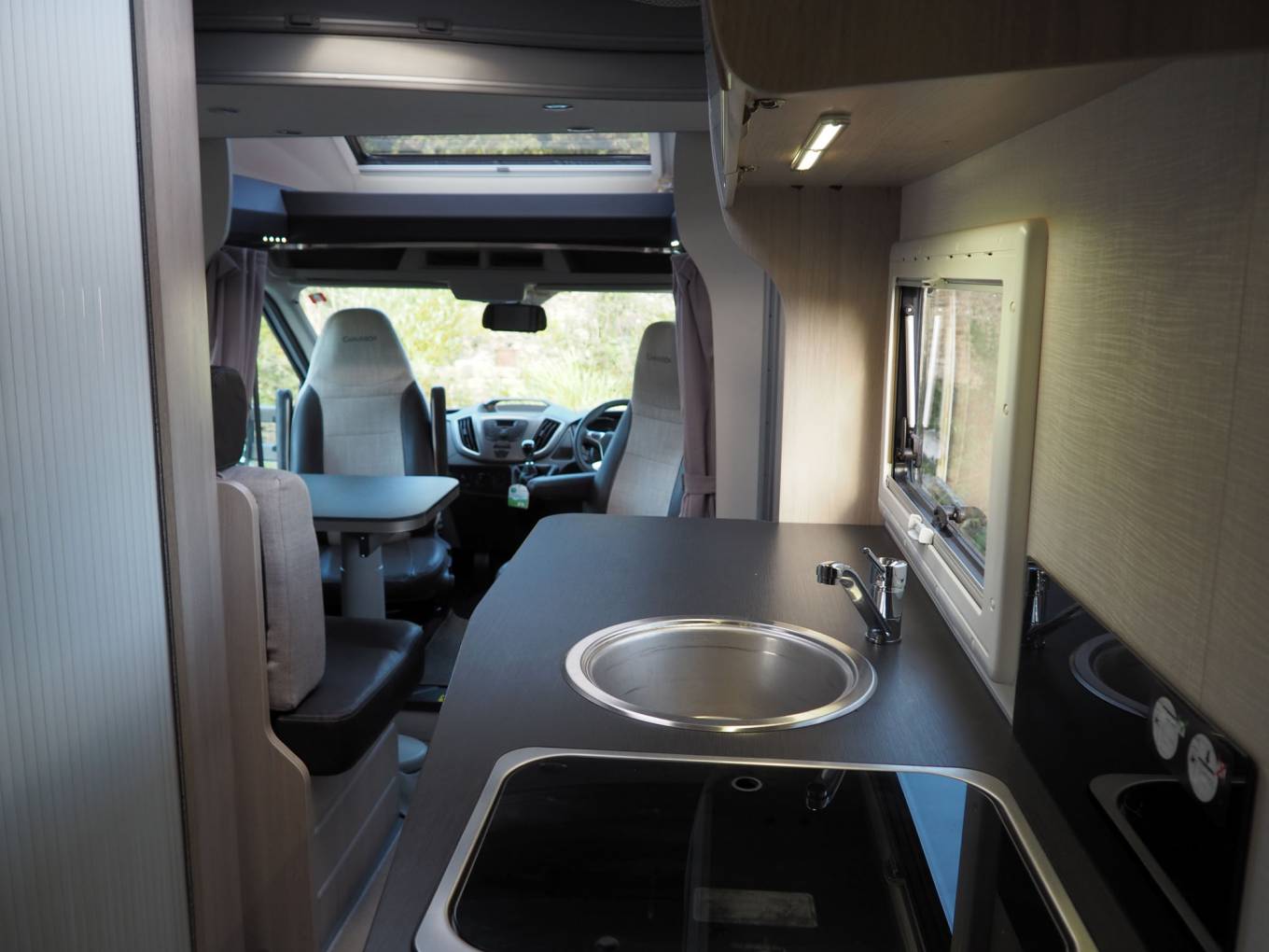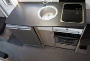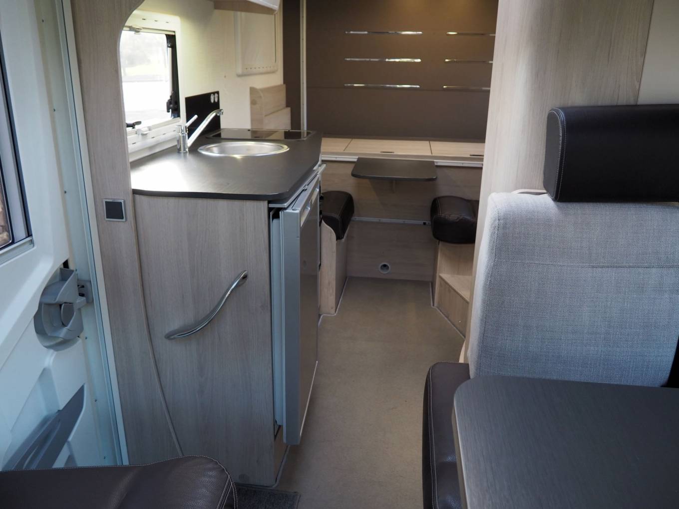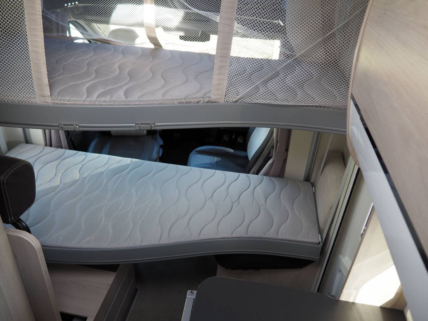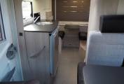 The layout comprises a forward dinette using swivelled cab seats, a centre washroom and kitchen, plus a small rear dinetted. There are 4 seatbelts in total, lots of storage inside plus the adjustable height garage at the rear. There is a variable height rear double bed over the rear garage which lowers from above, plus two bunks over the forward dinette, again lowered electrically. The dinette pedastal table is multi position so that all five of the seating positions have access at mealtimes, and it is variable height as well.