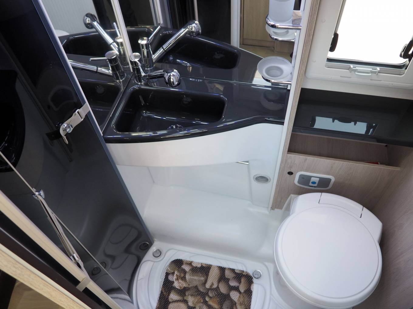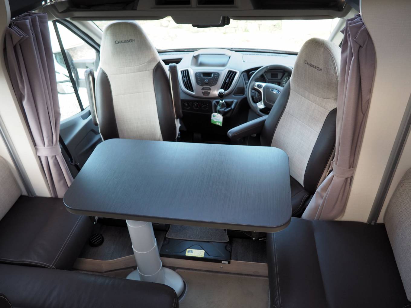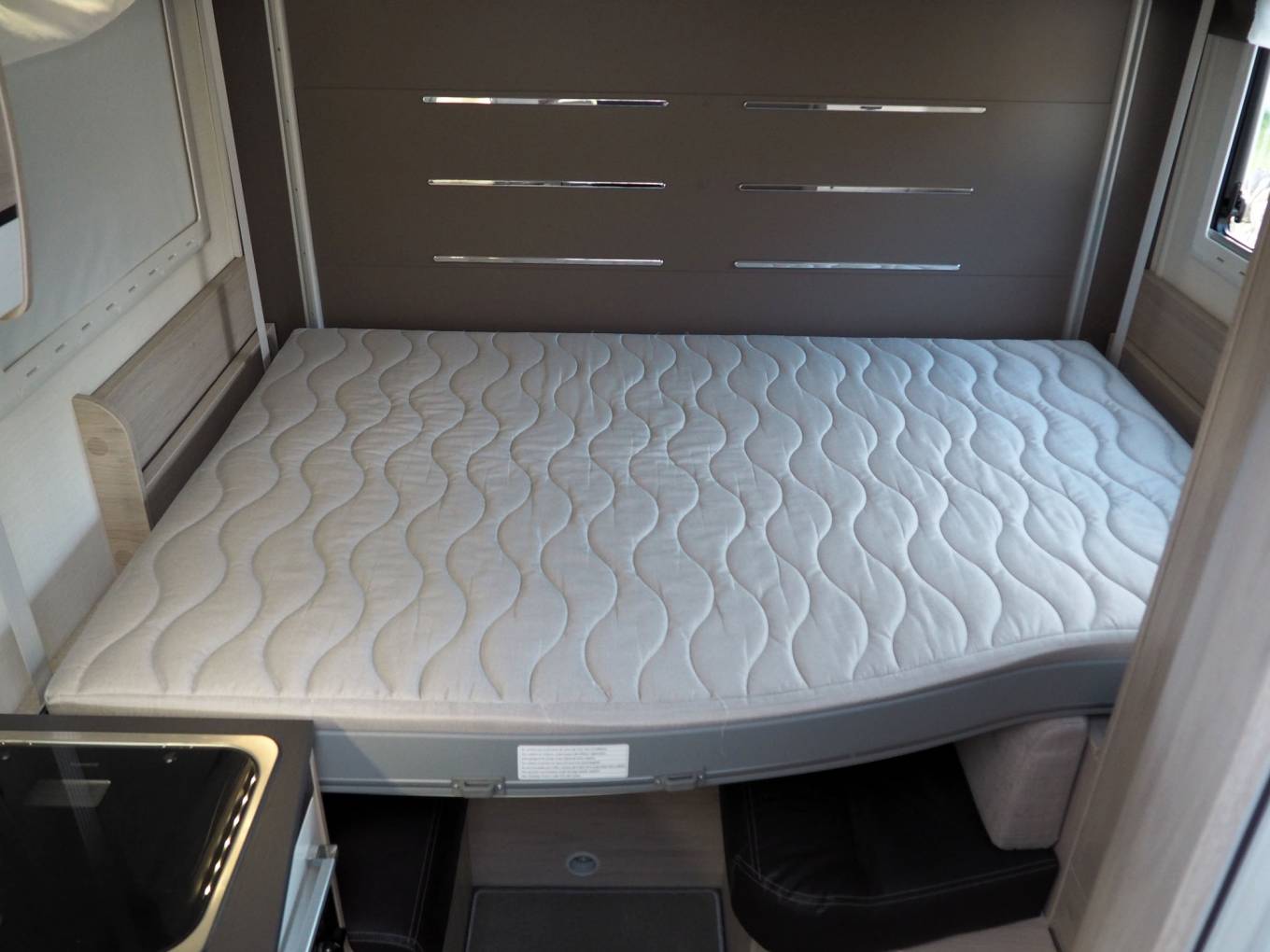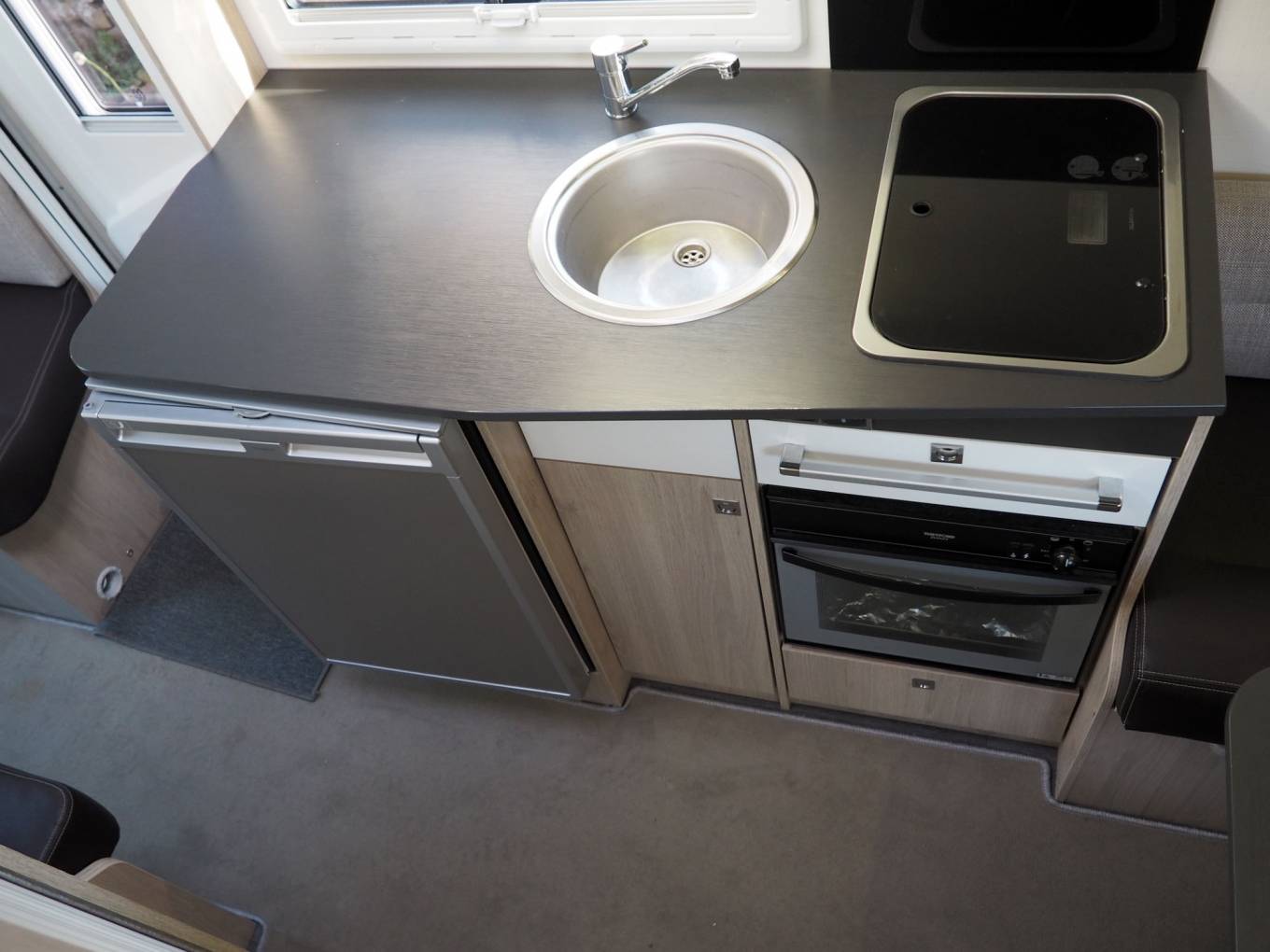 The layout comprises a forward dinette using swivelled cab seats, a centre washroom and kitchen, plus a small rear dinetted. There are 4 seatbelts in total, lots of storage inside plus the adjustable height garage at the rear. There is a variable height rear double bed over the rear garage which lowers from above, plus two bunks over the forward dinette, again lowered electrically. The dinette pedastal table is multi position so that all five of the seating positions have access at mealtimes, and it is variable height as well.