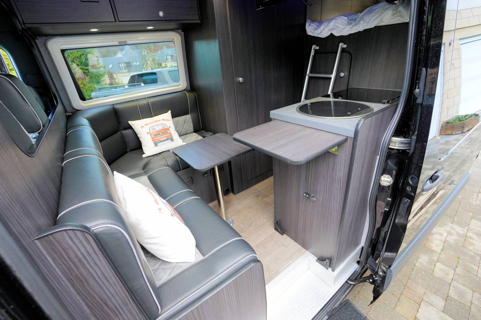 For sale we have a 2019 Mercedes-Benz Sprinter, 4-berth, 3-seatbelts, campervan (race van) with a large, fixed rear bed over a large garage and a smaller double bed made up in the lounge area.