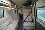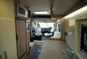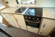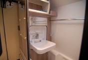Fit and finish is to a very high standard throughout, while storage is phenomenal for this class and there is an extensive array of kitchen drawers, aircraft style top lockers and an overcab compartment, plus a full wardrobe with double doors. There are a pair of tables with 3 choices of position in the generous dinette as you survey your chosen vista through the large sliding door. The dinette quickly converts into two single beds or one huge double. The kitchen offers full facilities including 142 litre tall fridge freezer, microwave, 3 burner hob, oven and grill. Opposite is the rear washroom with tip up vanity sink, toilet and shower.