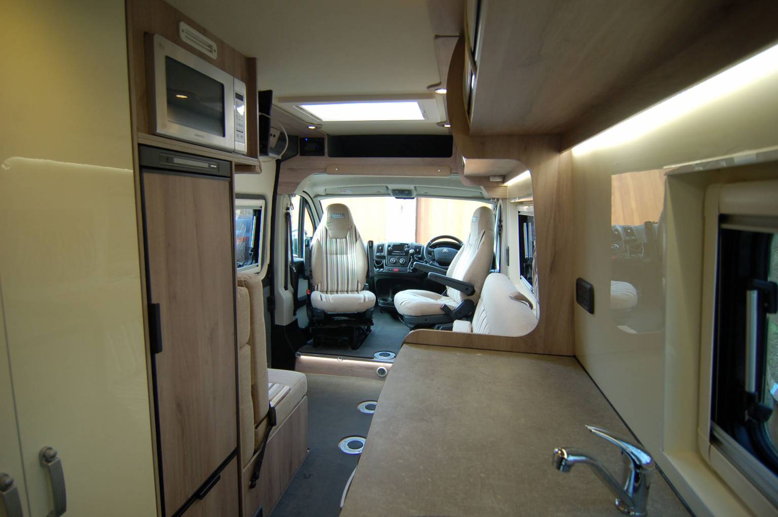 Ordered specifically in sky blue metallic paint and with additional specification, this motorhome is capable of being used for extended trips away, having very high build quality, 100 litre fresh and waste water tanks, twin leisure batteries, solar panel and onboard domestic LPG tank.