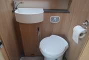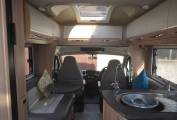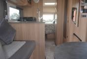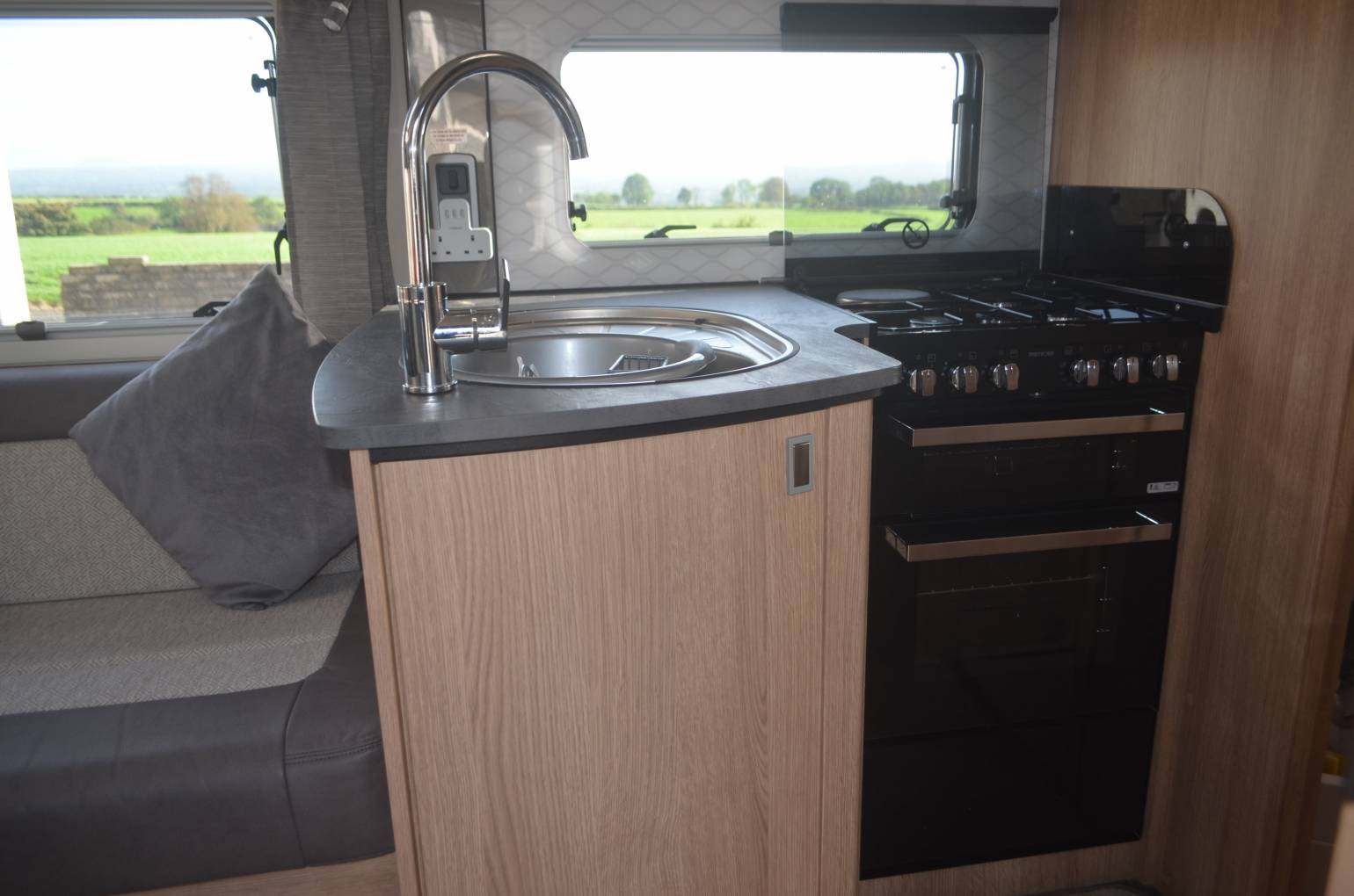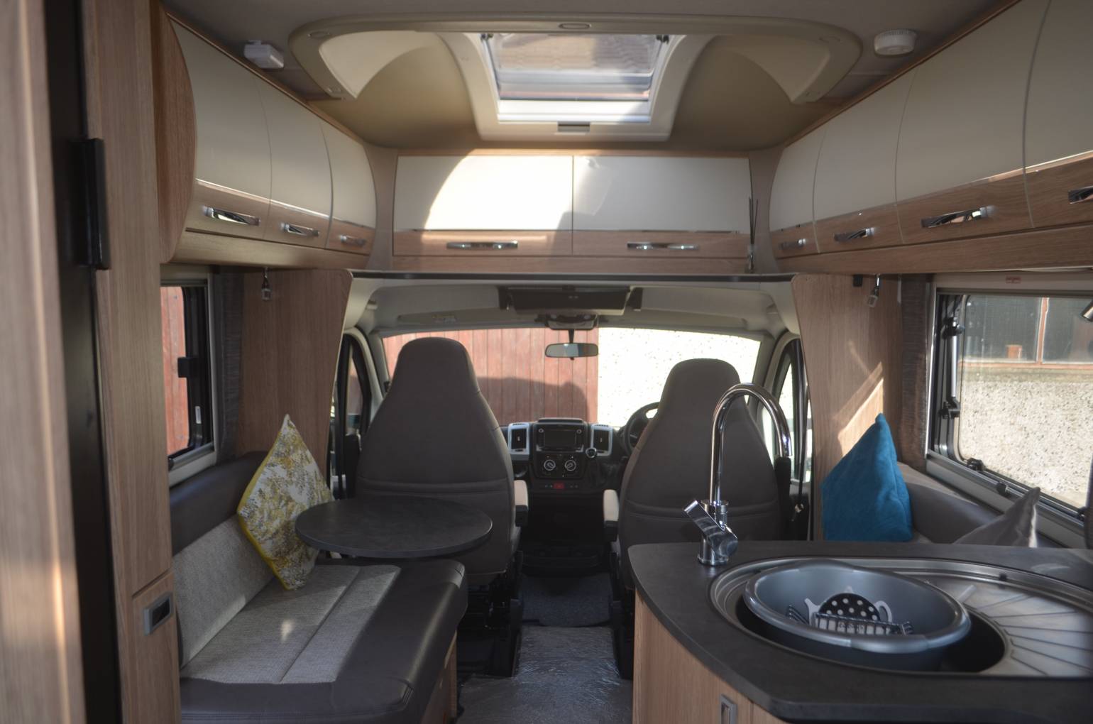 As you enter the motorhome the well appointed kitchen features a full sized cooker with an oven, grill, 3 burner gas hob, electric plate, 3 way fridge freezer, sink and a 12v roof vent.