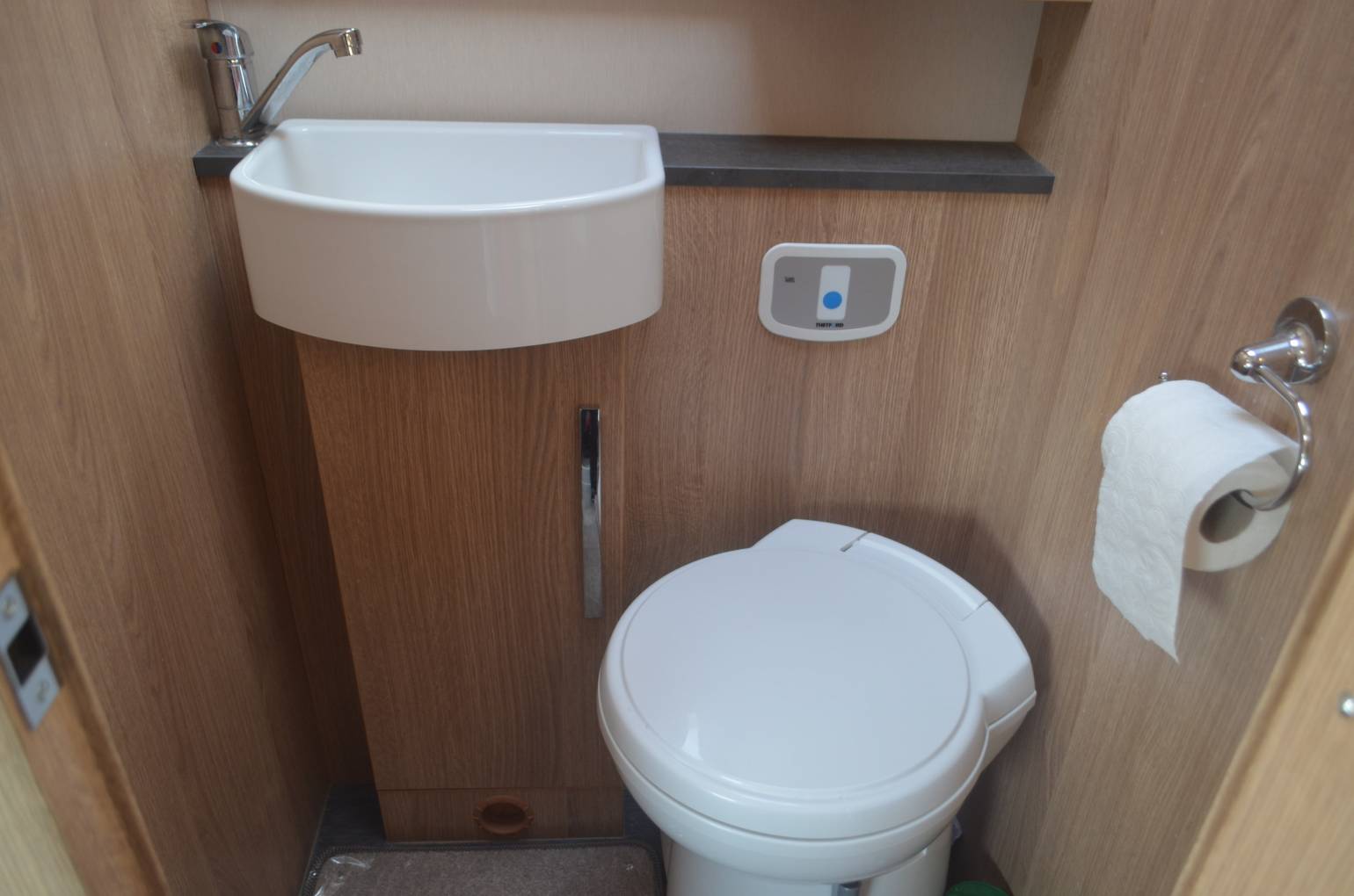 En suite has a separate shower cubicle and opposite is a stylish bathroom with a cassette toilet, wash hand basin and a vanity mirror.