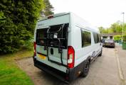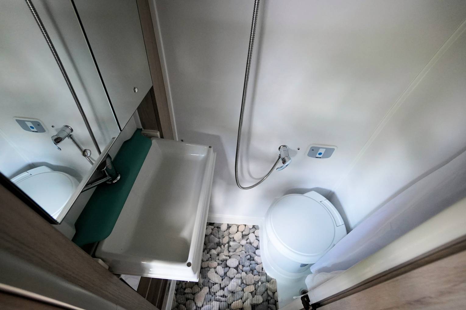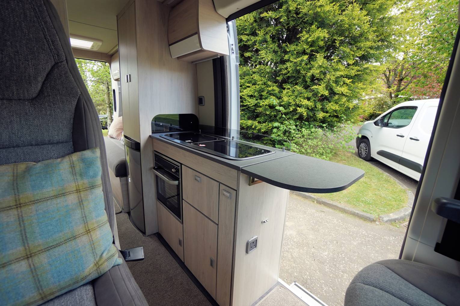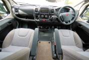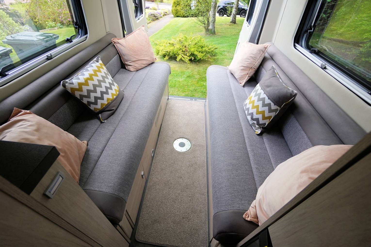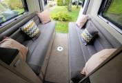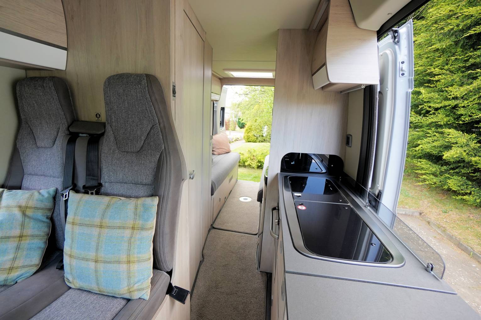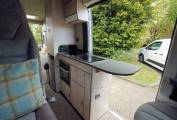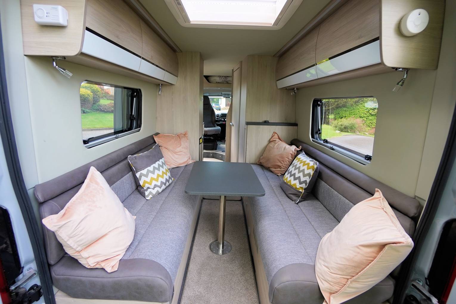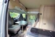 As you step into the motorhome using the side sliding door you will find a forward-facing bench seat complete with the two 3-point seatbelts and with the two fronts seats swivelled into the area there is room for four to relax in comfort. In the centre of the motorhome, is the kitchen area complete with 2-burner gas hob, stainless-steel sink with mixer tap, grill and 3-way fridge with freezer compartment. Opposite is the compact washroom complete with Thetford cassette toilet, fold-away basin with mixer tap and shower head. At the rear is the lovely lounge/dining/sleeping area that is fresh and bright. Install the stow-away table, open the rear doors revealing your favourite view and you have the perfect place for dining or just relaxing. The two settees convert into a large double bed or can be used as two single beds if preferred.