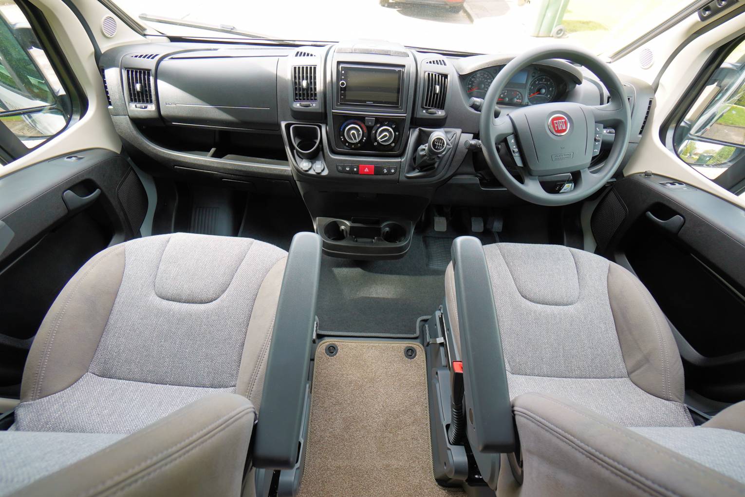 Heating and hot water is provided by a Truma dual-fuel system and has removeable carpets throughout, Remis folding blinds fitted to the cab windows, under-slung LPG tank, Fiamma wind-out awning, TV, Tracker and Thule bike-rack.