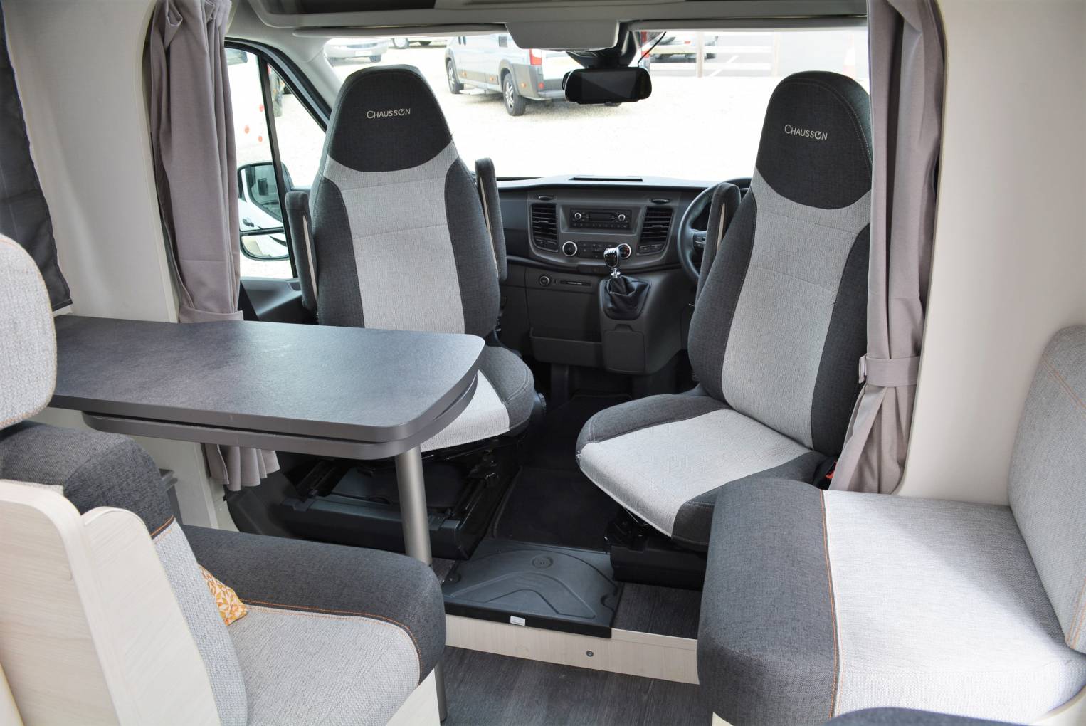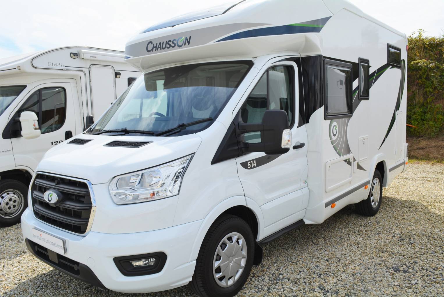 **viewing by appointment** 2020 Chausson 514 VIP 3 berth low profile motorhome for sale. This compact layout measuring just 5.99m offers great use of space with a transverse rear double bed which can be manually adjusted in height, large garage area with double door access, kitchen area with microwave or can be changed for a grill, washroom with shower and a front lounge area featuring twin swivel chairs and a third berth. Other features include 2 additional travel seats, cab air conditioning, cruise control, DAB radio, reverse camera, large roof light over the cabin area, on the road diesel heating, 10L hot water system, solar panel, awning, TV & aerial, Led lighting and grade 3 insulation. Chosen chassis is a Ford Transit 3500kg which can be driven on a standard car license. 1 years warranty is included in the sale. Finance and part exchange available. Please call for further information...