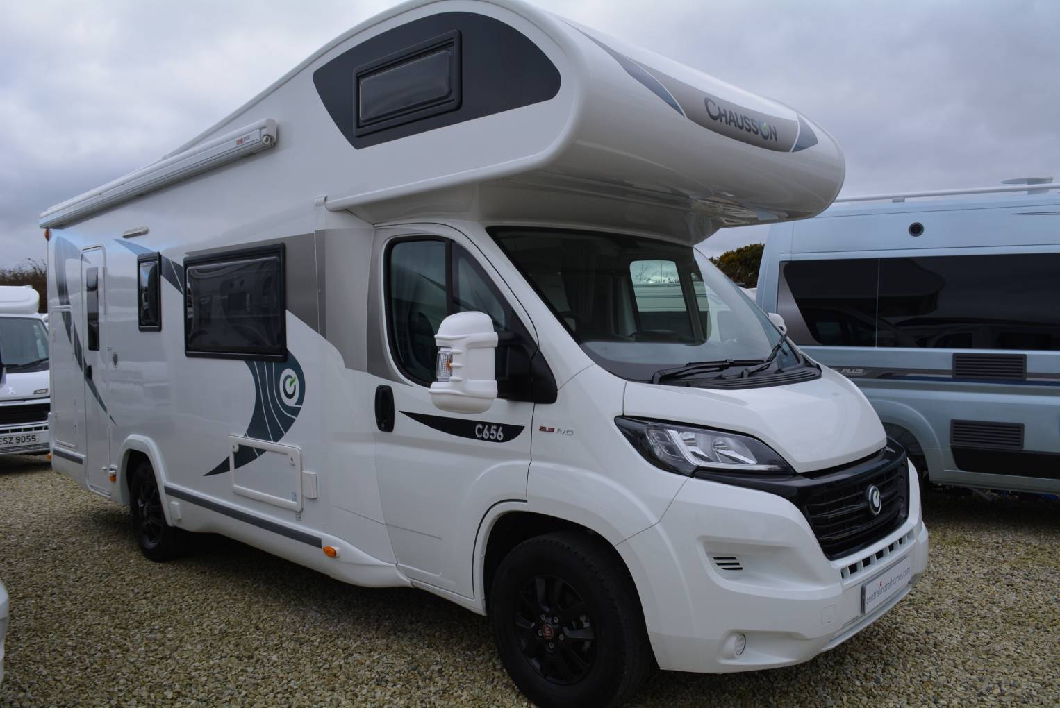 **viewing by appointment** 2020 Chausson C656 7 berth motorhome for sale. This family motorhome comes with a huge specification and is presented in nice condition both inside and out. With 7 berths and 7 travel seats there is room for all the family and also includes washroom with separate shower, kitchen with cooker, large fridge freezer and sink, twin rear bunks with the lower folding away to create a garage space, front dinette area and a large overcab bed. The base specification is a 3500kg Fiat Ducato motorhome chassis with a 2300cc 140hp engine and manual transmission measuring just under 7 metres in length and includes a colour coded body with 16" Fiat black alloy wheels. Other equipment includes external BBQ point, awning, solar panel, tow bar, 4 rail bike rack, reverse camera, mirror covers, Satellite with TV, inverter unit, Led lighting,cab air con, cruise control and on the road heating. Sale includes one years warranty. Finance and part exchange available. Please call for further details...