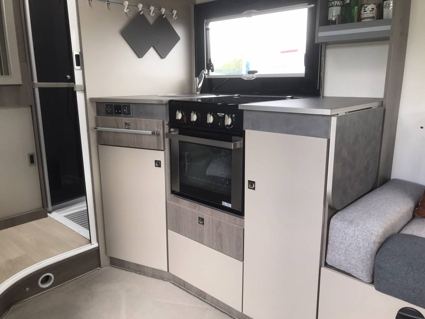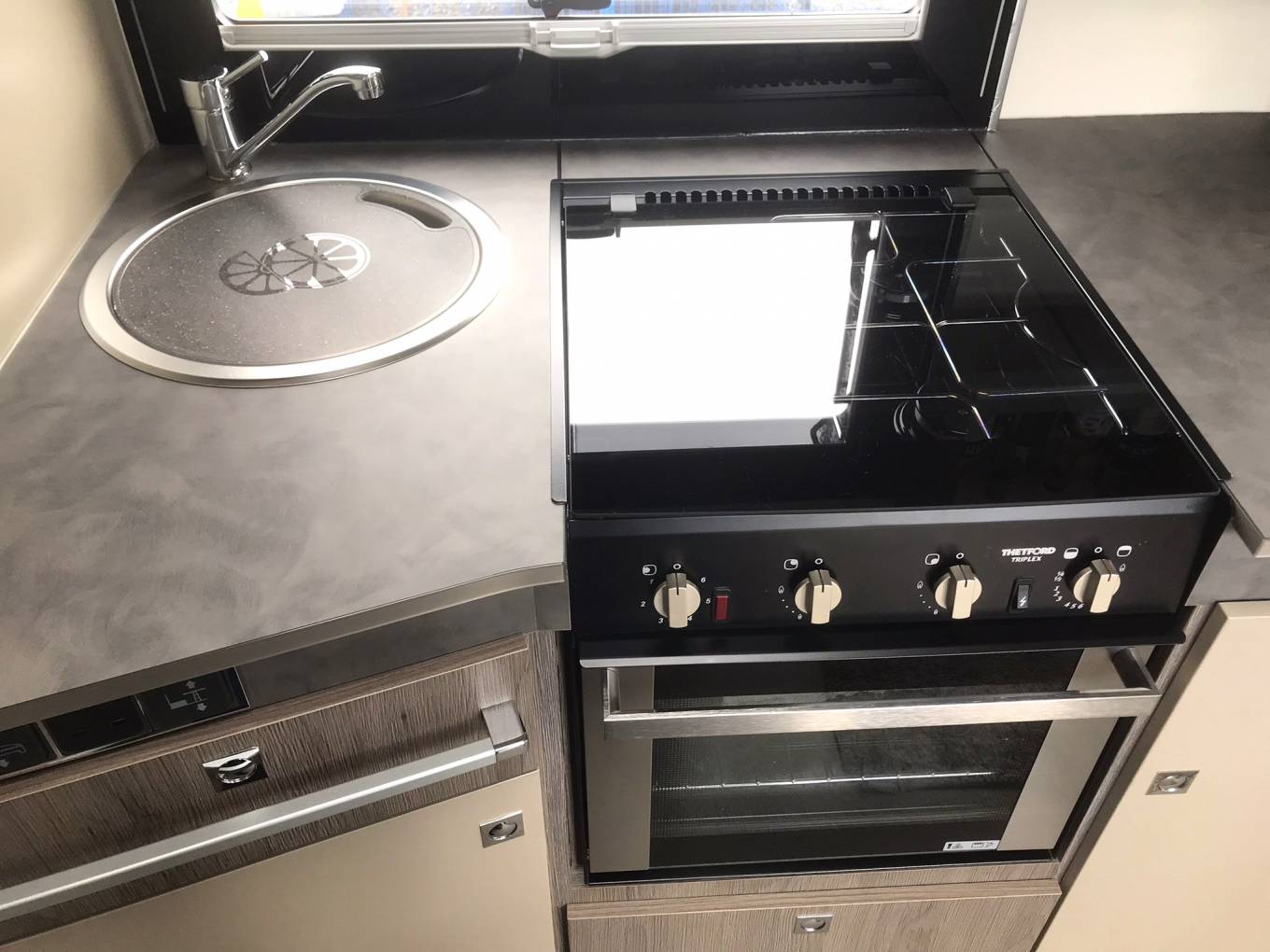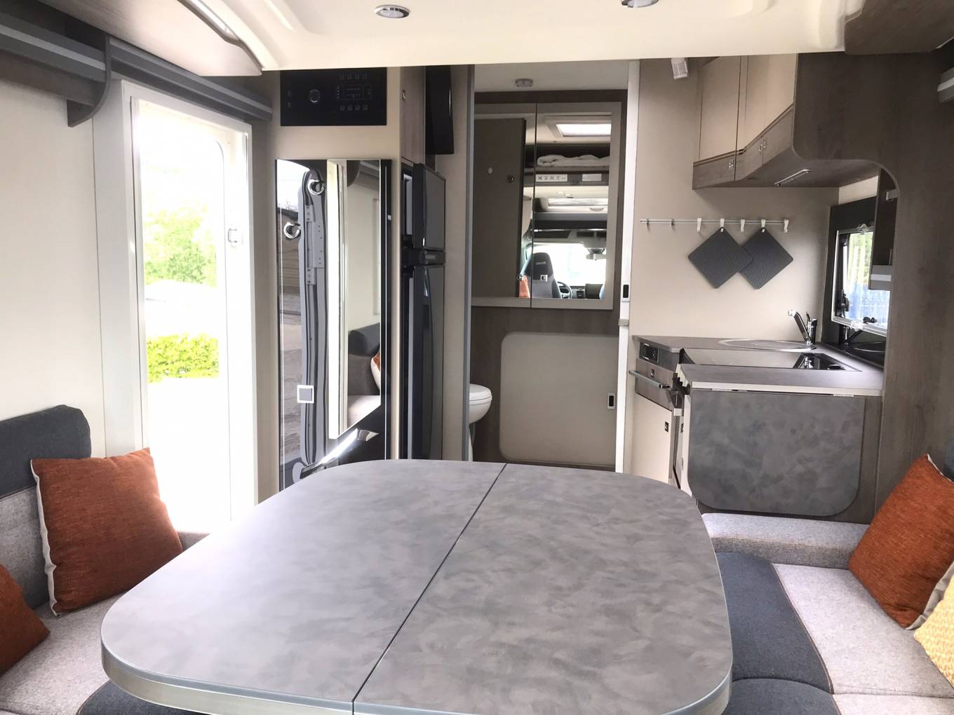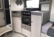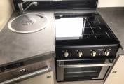 Mid vehicle kitchen which includes hob (2 gas and 1 electric), oven with grill, sink, large fridge freezer and storage.