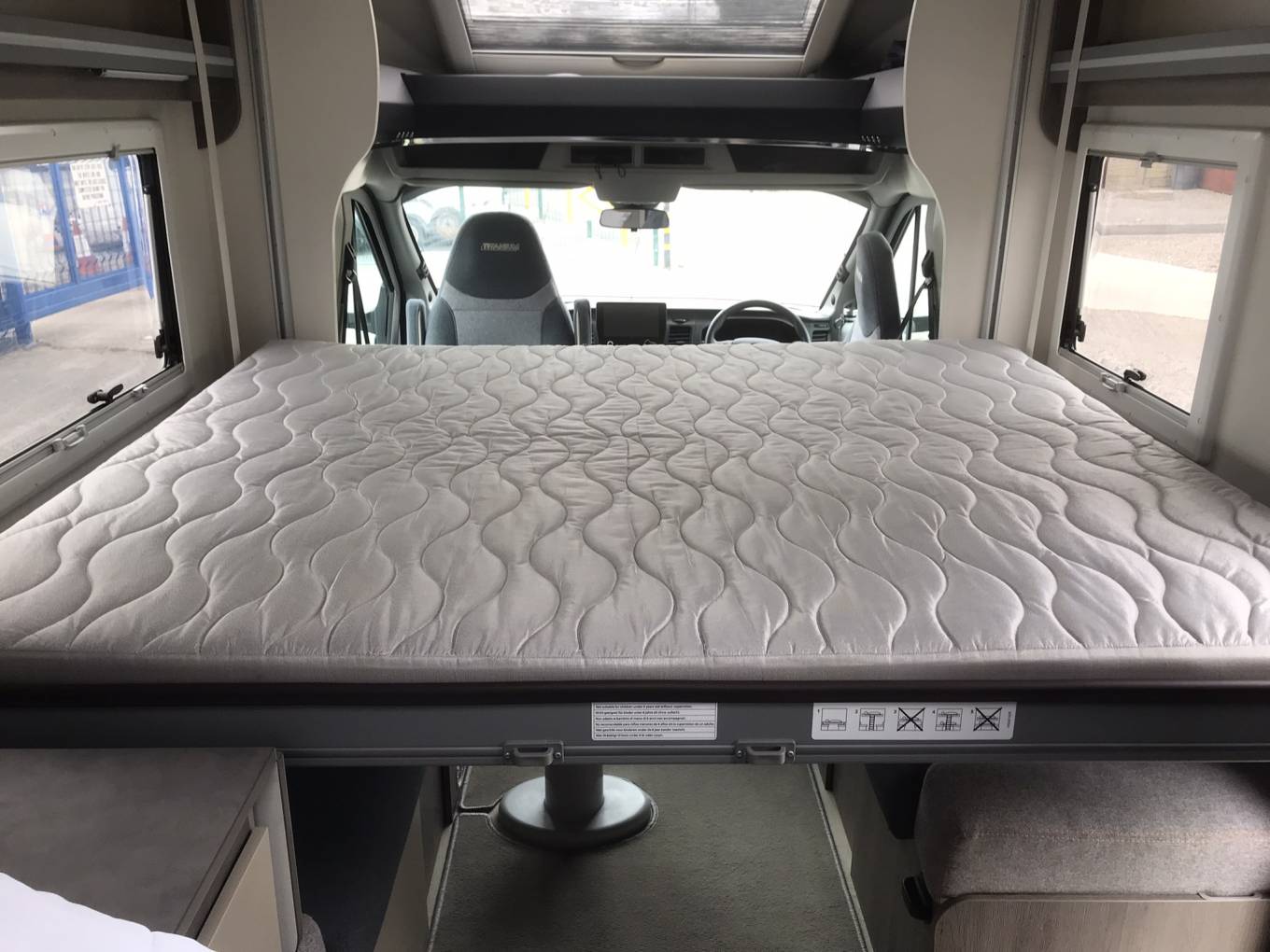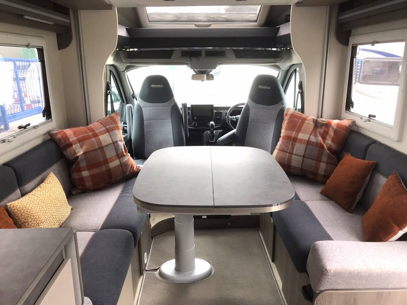 Front lounge dinette with bed above. The cab seats swivel to join a corner sofa and bench sofa. 2 passenger seatbelts are located here.