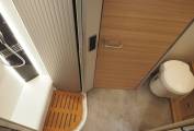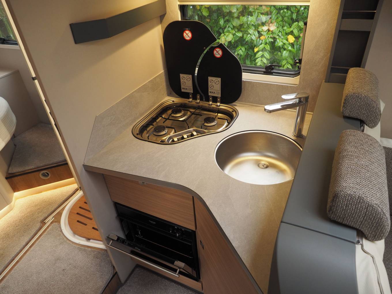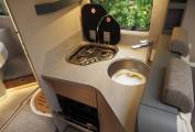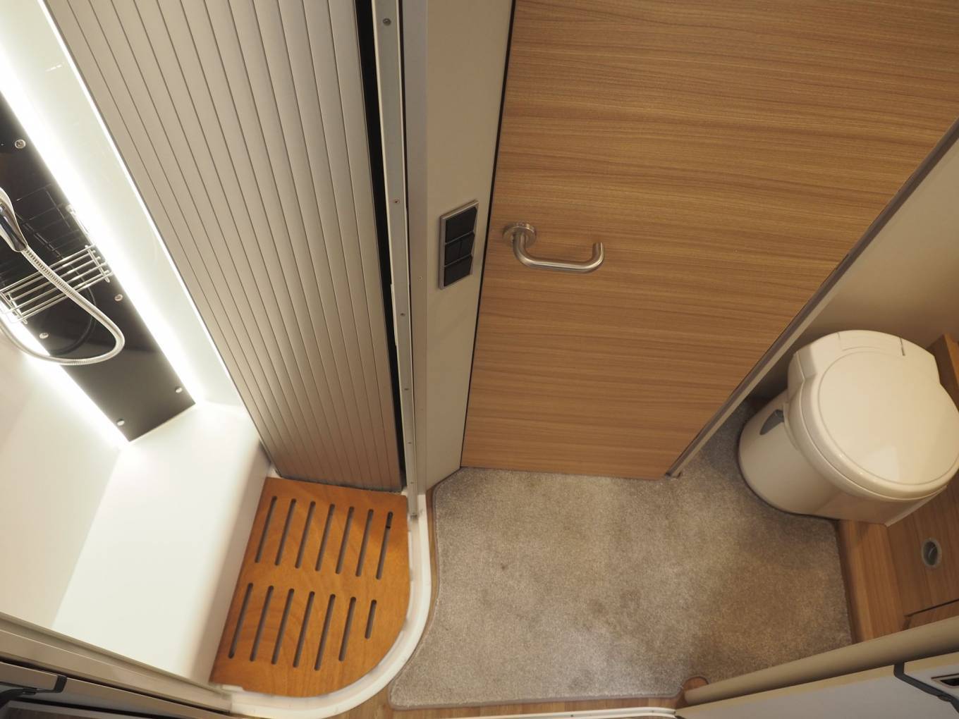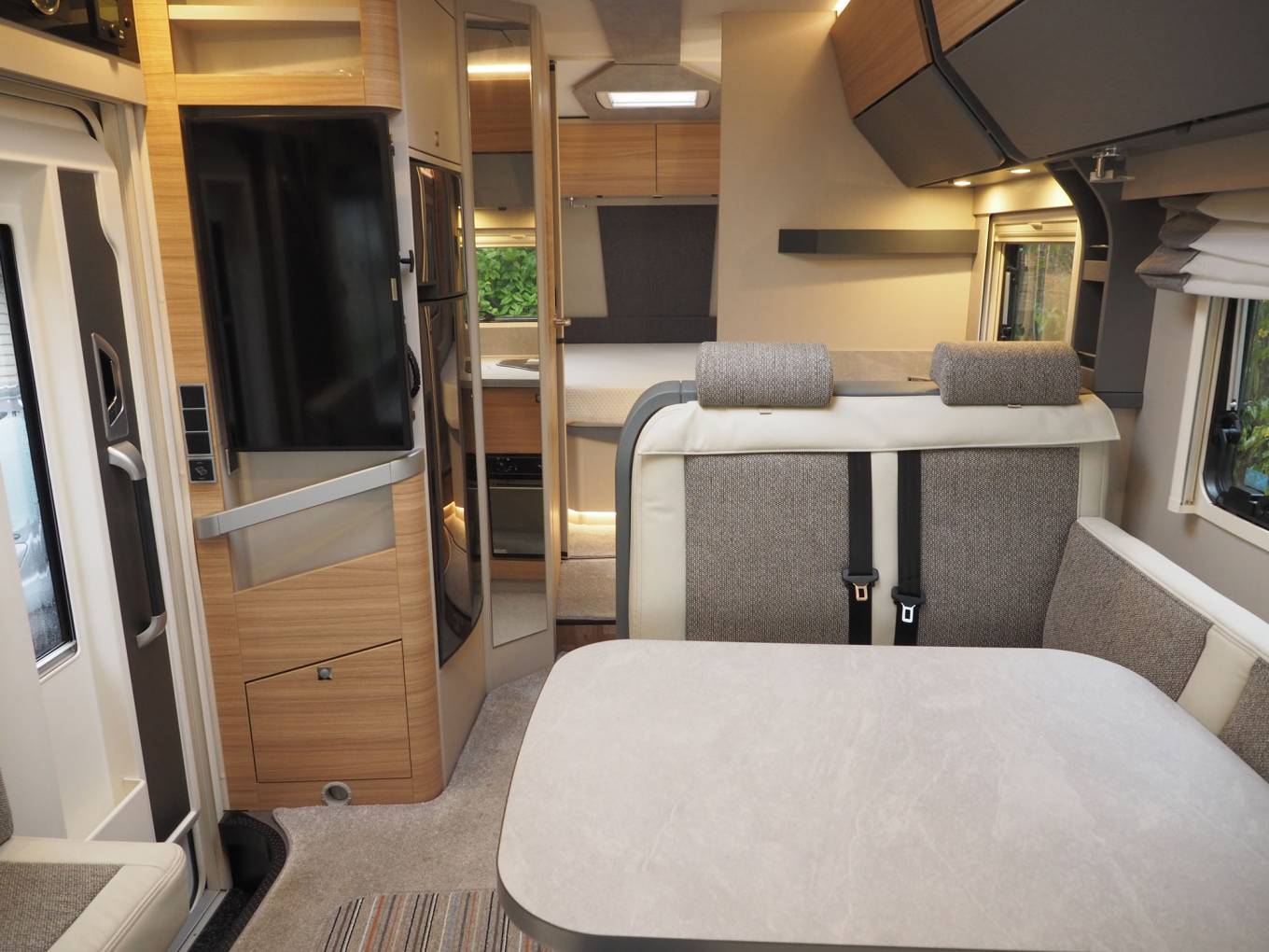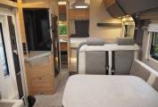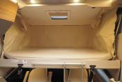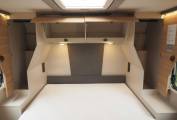 rear bedroom has two sidewall wardrobes and loads of cupboards above the bed. The warm air Thule 6E dual fuel boiler and fridge enable wild