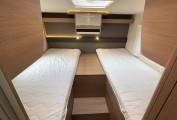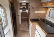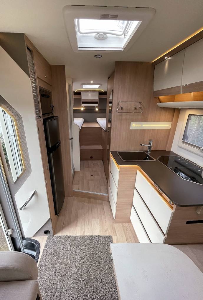 doors; an en-suite split washroom with a separate shower to the foot of the beds; a centre kitchen which is fully equipped with a 3-ring gas hob, combined oven & grill, sink with hot & cold mixer tap and large fridge with separate freezer; a forward dinette and swivel Captain seats, which when