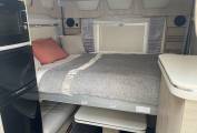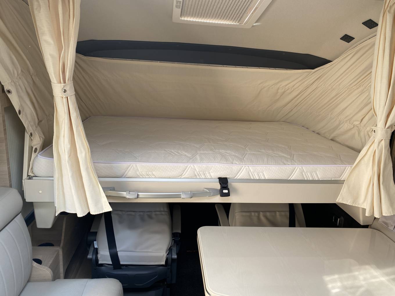 This motorhome has unique layout which provides ultimate luxury and convenience. For sleeping this vehicle has an electric double bed over the rear u shaped lounge, and a pull-down double bed over the cab. The cab seats both swivel to face the dining area that could comfortably accommodate 5 persons. The dining area seating has two additional seatbelts to allow 4 persons to travel. The middle of the vehicle consists of a fully equipped kitchen area with a combination oven/grill above the fridge with a separate freezer, and an induction hob next to the sink and also located in the middle of the vehicle is the bathroom with a toilet, hand basin and separately screened shower. The rear of the vehicle is home to a comfortable U-shaped lounge, located above a large externally accessed garage.