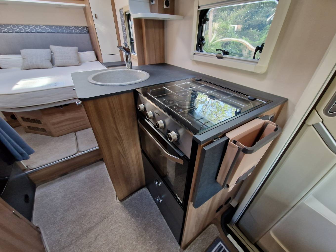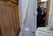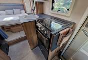 At the rear we have a good sized island bed, with luxury topper and adjustment for a longer bed and daytime space setting. The bed lifts up for storage, there are twin hanger wardrobes and storage lockers. This motorhome is open plan and therefore has a non-constrictive feel, however, there is a privacy curtain for the bedroom. The central kitchen area is practical and has lift up extra work top on each end. There is a fitted microwave, Thetford oven/grill, 3 gas burner hob, huge sink and mixer tap, slim line double hinged tower fridge freezer (with extra shelves and twin cooling fan upgrade), 2 way fan, and good storage.