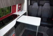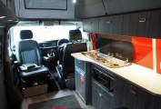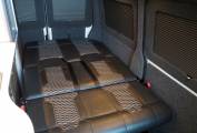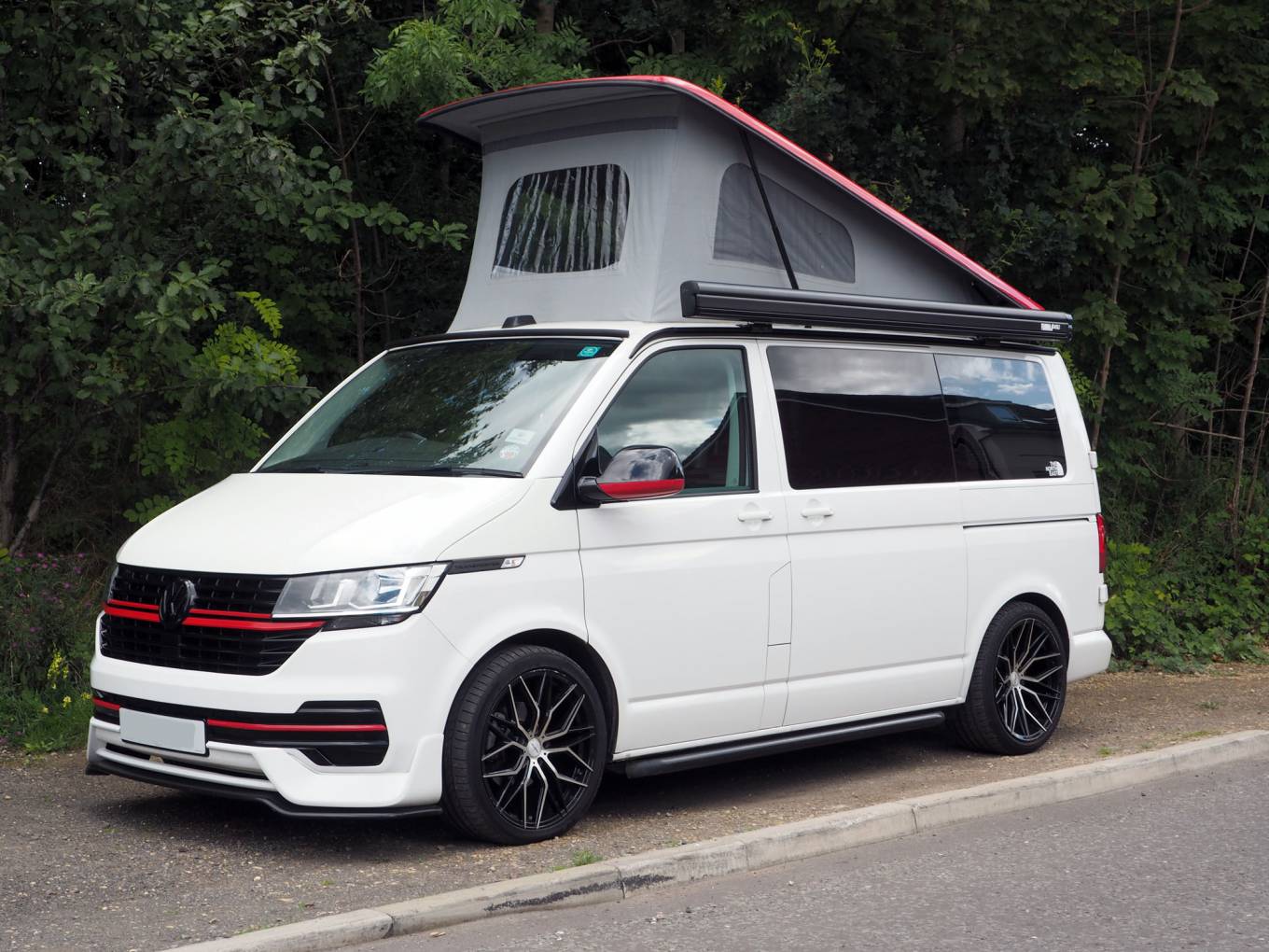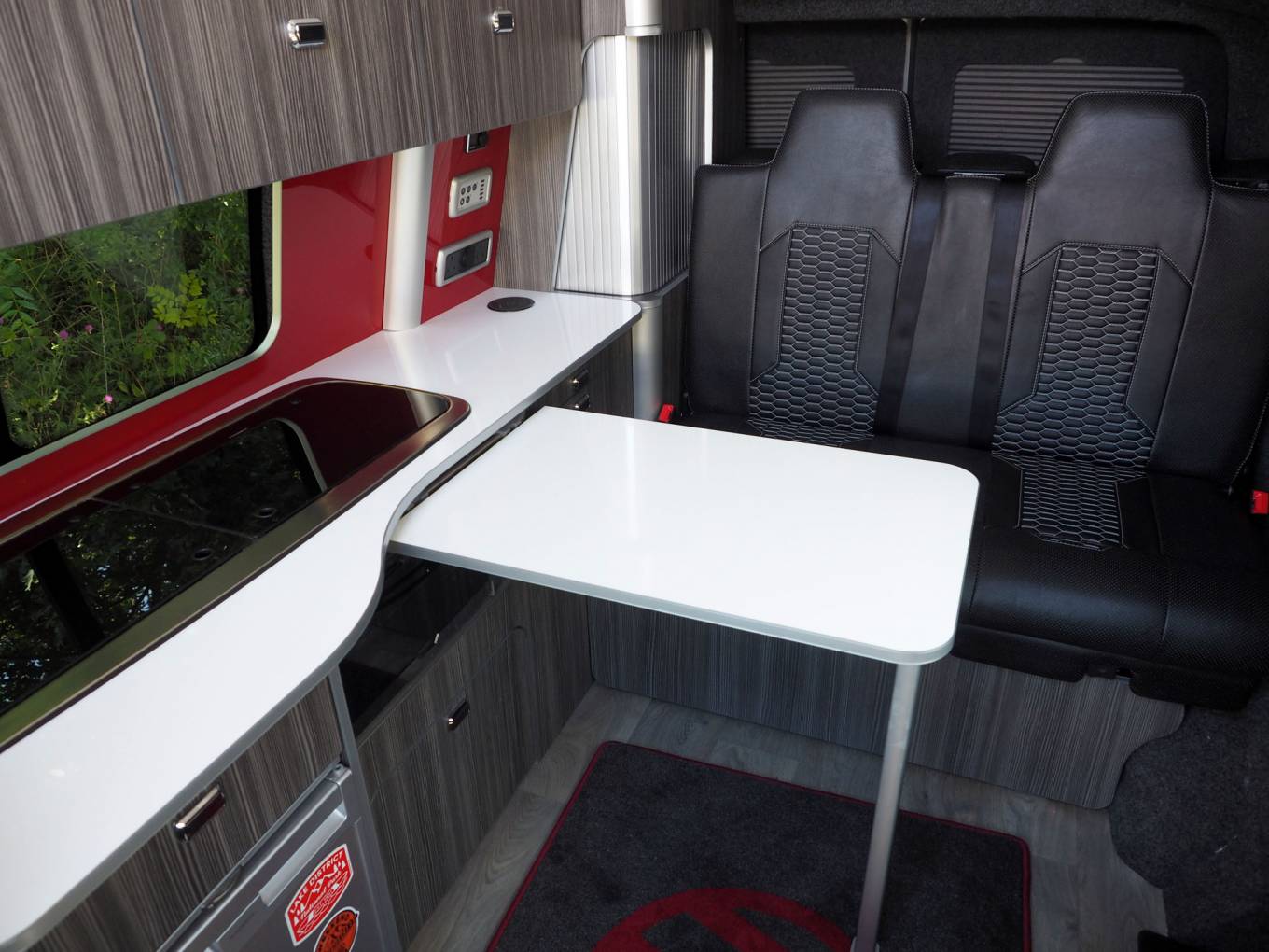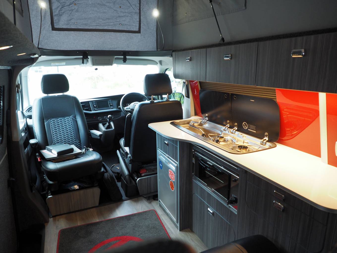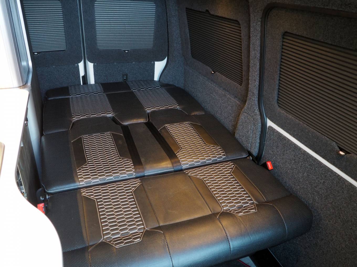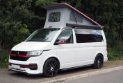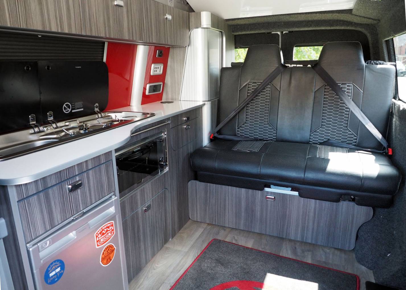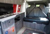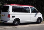 Attractively styled premium campervan conversion by All Seasons of Washington, having excellent specification including awning, towbar, diesel heating. Fitted with a high qualtiy rear seat which easily makes the lower bed, this vehicle has 4 seatbelts in total. The roof bed is of good size, has lighting, side mesh vents and a front window in the shroud.