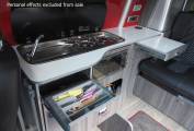 In the living space, the single passenger seat swivels, allowing for easy movement in and out of the cab area from the dinette. There is a hook on dining table, 12v fridge, cold water system, twin gas burners, full electrics with habitation battery, charger and mains sockets. There is good storage too, under and over the kitchen, a rear corner cupboard and under the rear seat. All the habitation windows have night blinds and the cab has a screen cover for privacy.