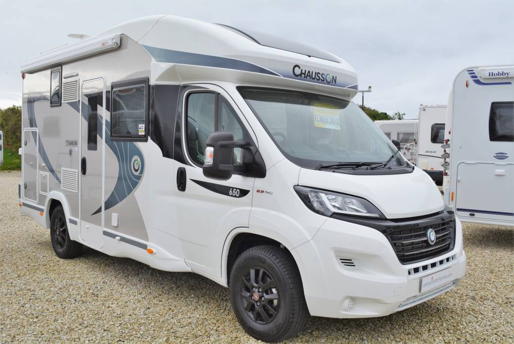**viewing by appointment** 2021 Chausson 650 Titanium VIP Automatic low profile Motorhome for sale. Presented in excellent condition with a host of both standard and extra equipment making this compact luxury model the perfect get away vehicle for 2 or 4 people. Measuring just 6.4m in length but with a large lounge area, extensive kitchen area, washroom with separate shower, rear wardrobe and a large garage which can be accessed from either side, Chausson really have made great use of the space on this 650 model. The specification includes Fiat Ducato 3500kg chassis with a 2300cc 140hp upgraded engine, 9 speed automatic transmission, cab air con, cruise control, cab shades, colour coded cab, taupe grey side walls, 16" Fiat alloy wheels, awning, solar panel, bike rack, TV & aerial, external BBQ point, external shower point, reverse camera, panoramic sky light, twin swivel chairs, drop down bed, 4 travel seats, full kitchen with large fridge freezer, grade 3 insulation and on the road heating. Please call for further details. Finance and part exchange available...