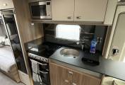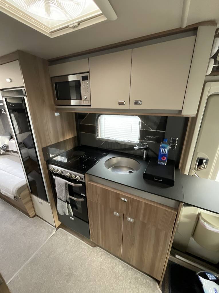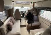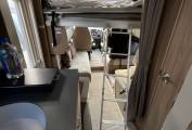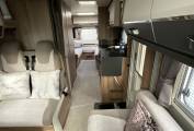 Moving to the centre, the kitchen includes all the facilities you would expect from this size of vehicle - an oven, grill and 4 burner hob (1 electric), a large fridge with freezer compartment which has the facility for the door to open both ways! The kitchen also has a microwave, under cupboard LED lighting and an extendable worksurface. The Motorhome has a winter pack fitted as standard, fitted carpets making winter breaks a must as there is also the dual fuel Alde central heating system that can be controlled from an app on your phone.