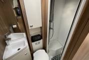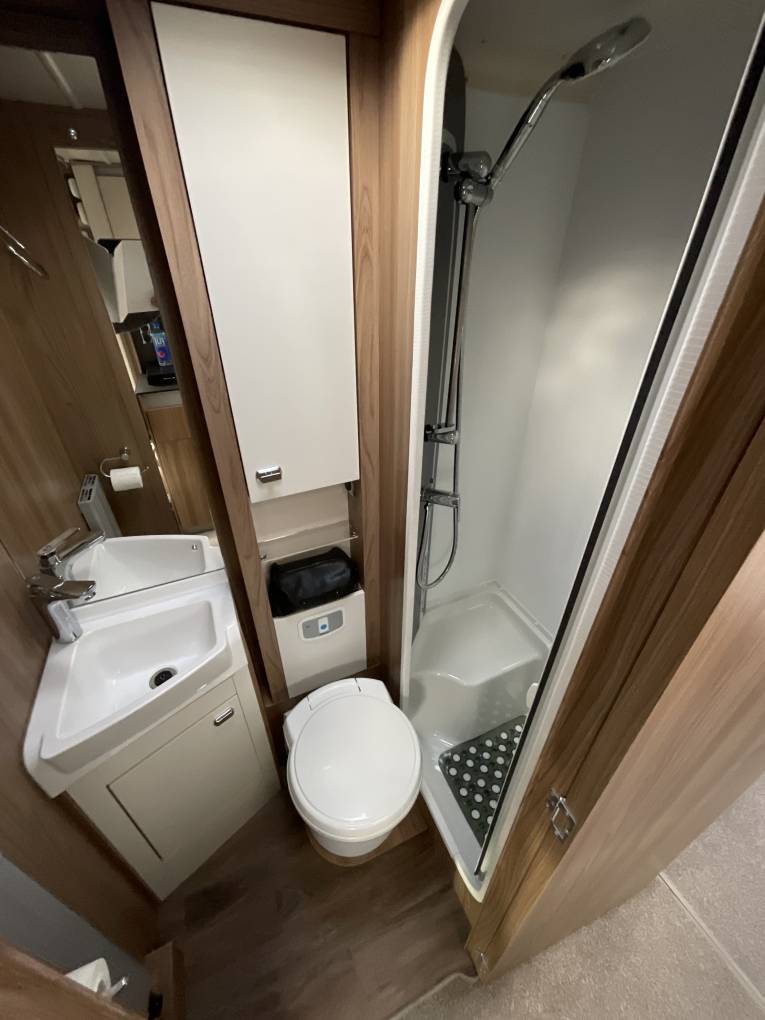 Opposite the kitchen area is also a large bathroom, consisting of a separate shower, cassette toilet, radiator and vanity unit with plenty of lighting and storage. Next to the bathroom is a large wardrobe with storage space below.
