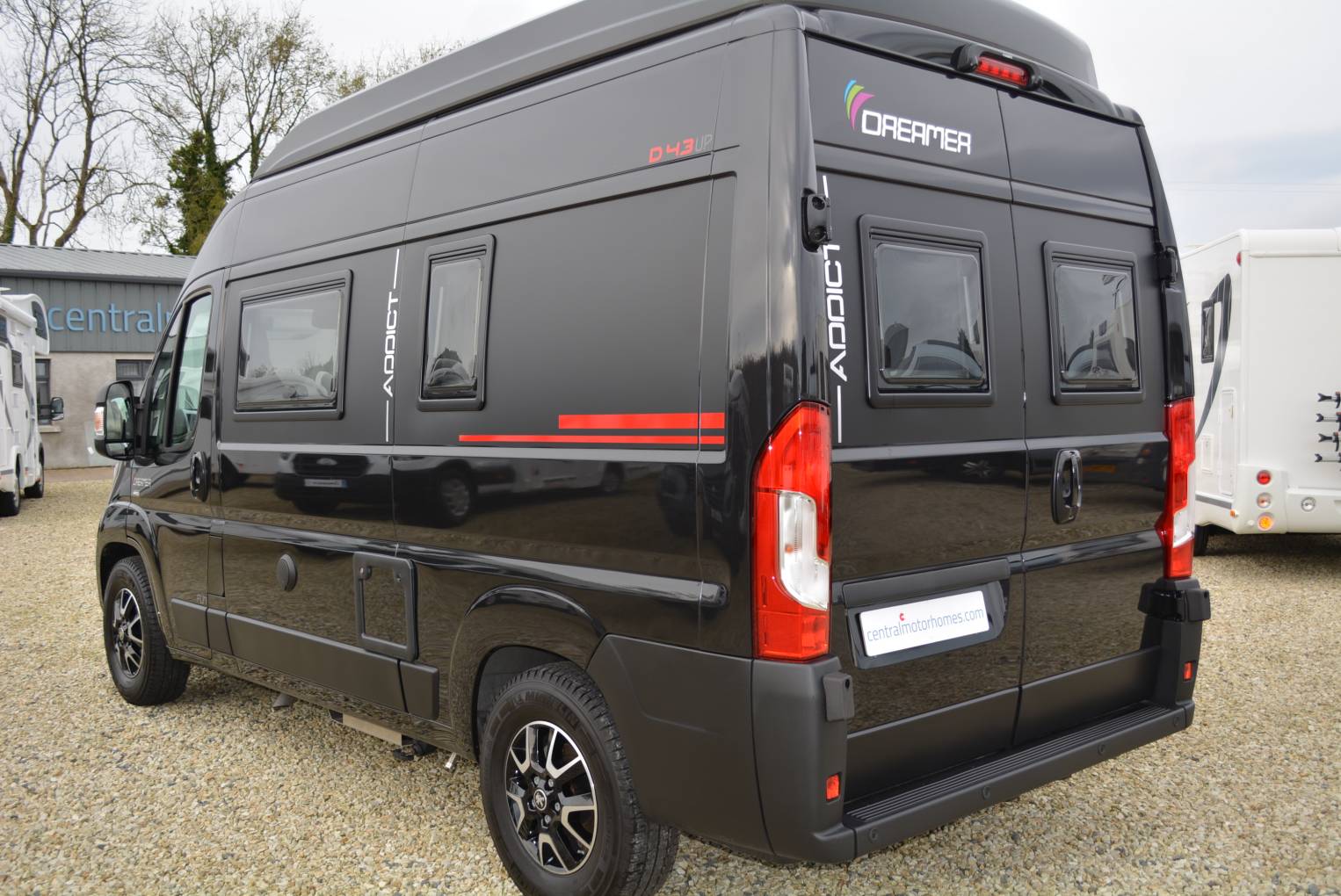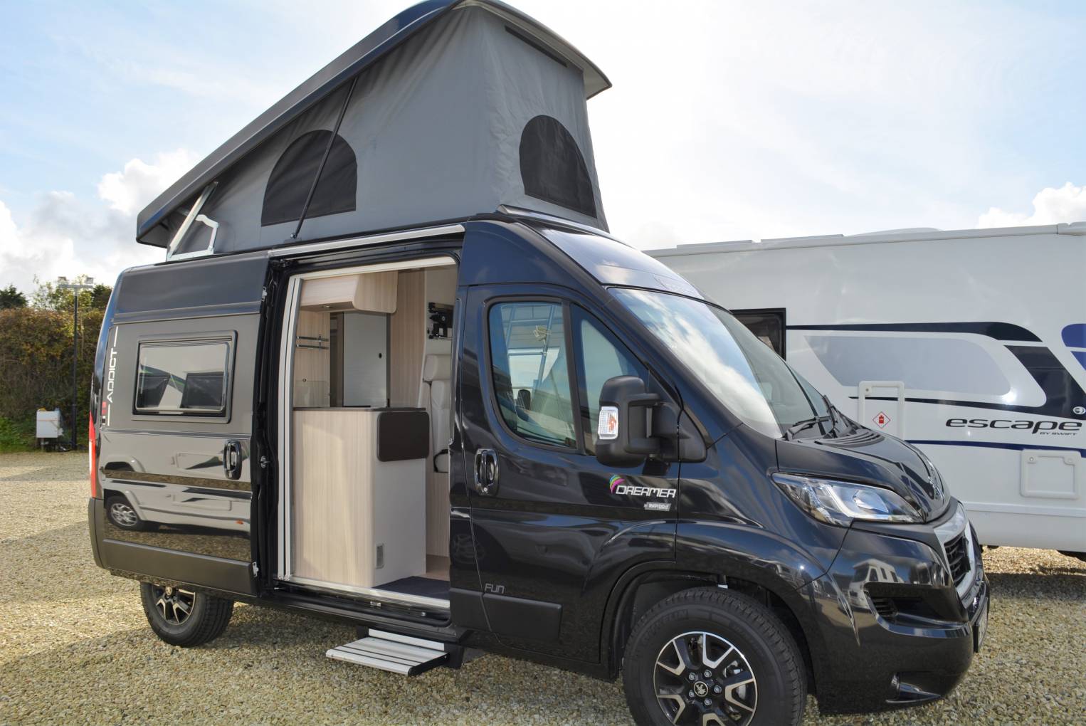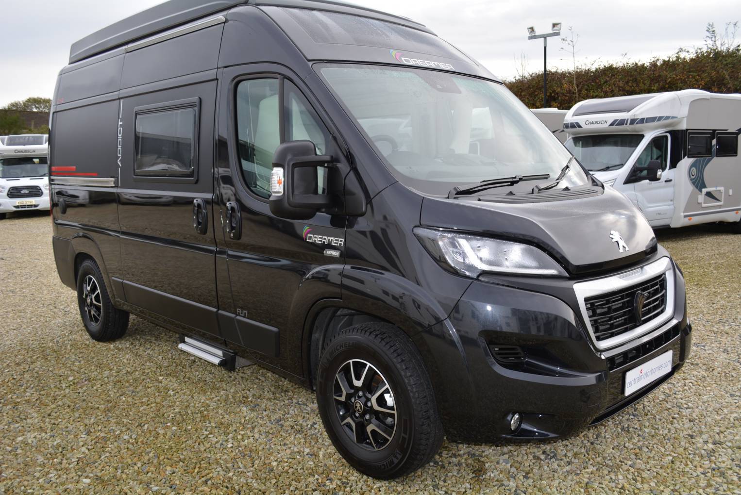 **viewing by appointment** 2022 Dreamer D43 Up 4 berth compact camper for sale. Based on the trusted Peugeot Boxer 2.2l 3500kg chassis with an overall length of 5.4m making this a very usable camper indeed. The high specification includes 4 travel seats, rear transverse double bed, heated pop up roof with double bed and Led lighting, Addict pack fitted including black bodywork, living area carpets, DAB radio, reverse camera and oven, washroom with shower, basin & toilet, kitchen with hob, sink, oven and fridge, electric step, alloy wheels, rear storage area, twin swivel chairs, cab air conditioning, cruise control, cab shades, panoramic roof, webasto diesel heating and front fog lamps. Finance and part exchange available. Please call for further details....