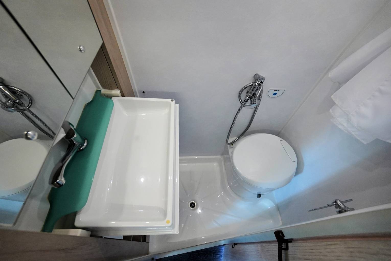 • Washroom with Thetford cassette toilet, vanity unit, fold-away basin and shower