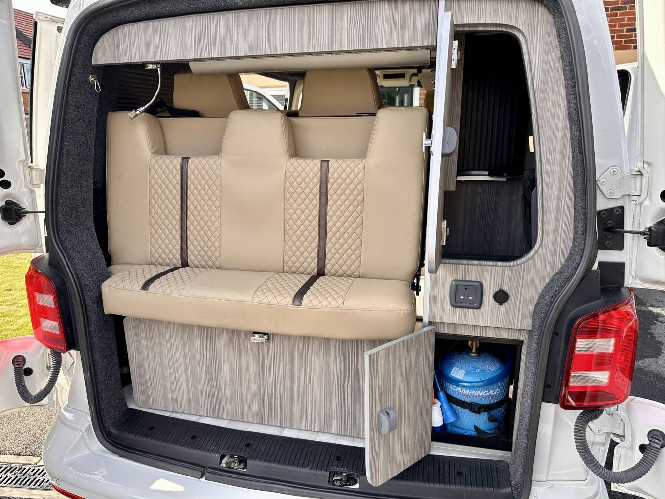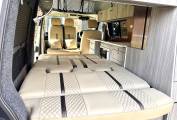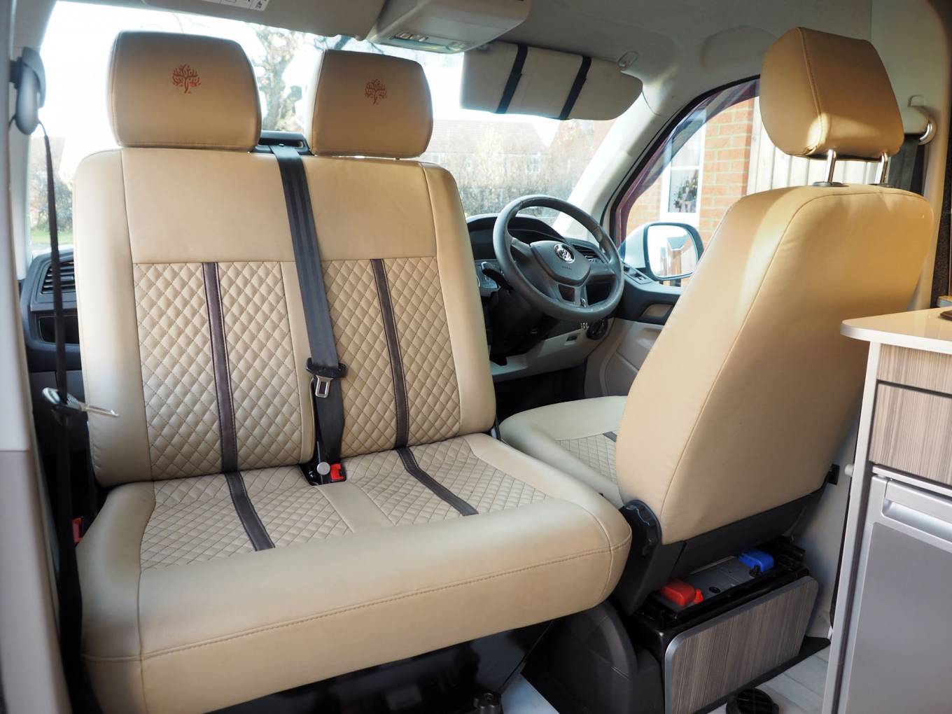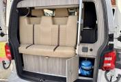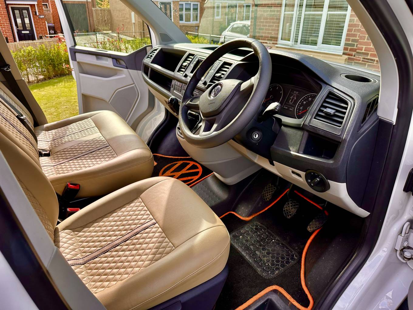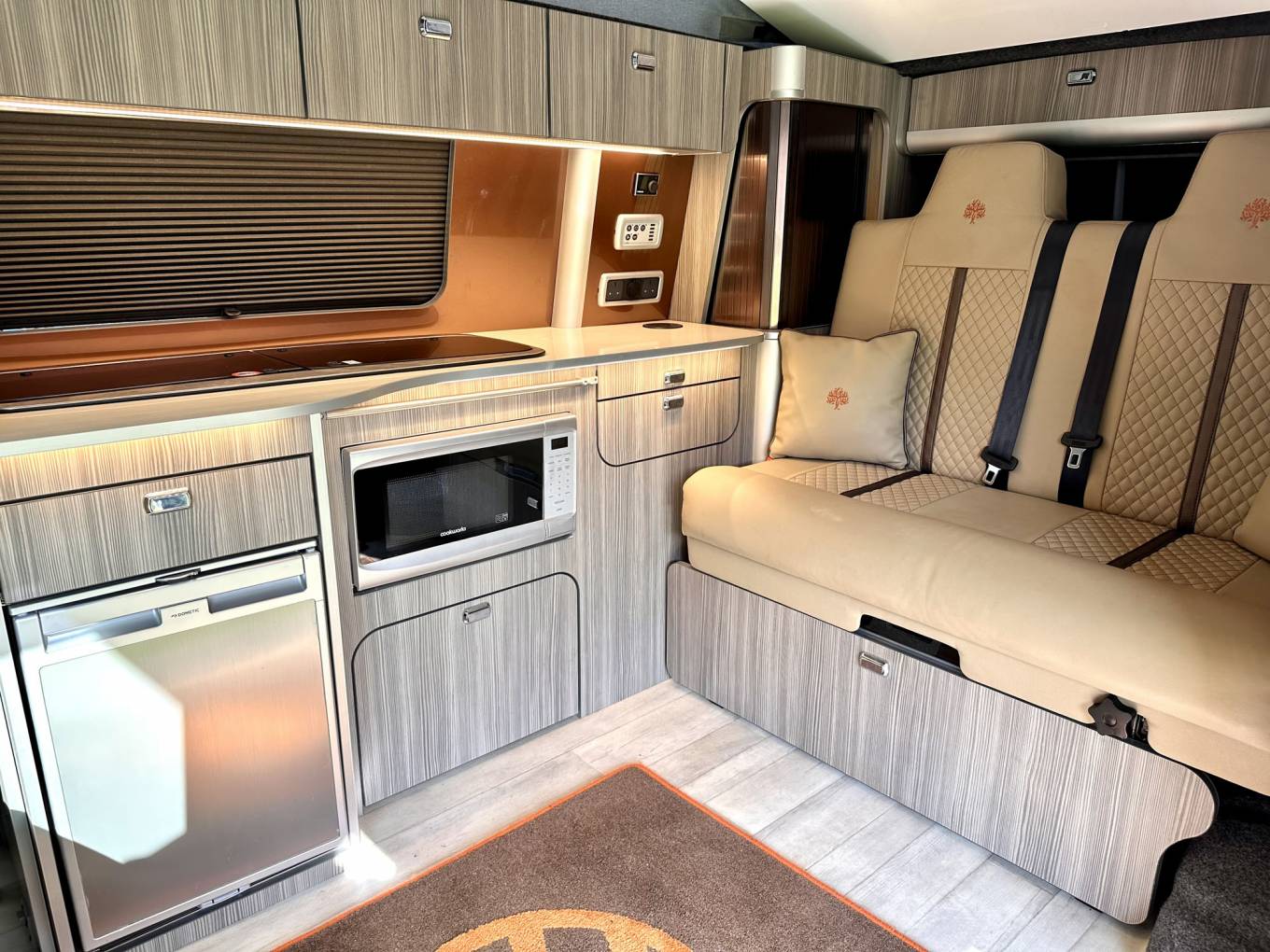Classy and understated, this VW has an attractive white exterior with Riviera 20 inch silver alloys and 275 x 35 tyres, front spoiler kit and side bars, colur coded mirrors. The internal colourway is also very pleasing to the eye, having light tan cross stitched leather with copper and brown detailing, copper solid panel to the kitchen area and complimenting furniture with brushed steel colour detailing to edges.